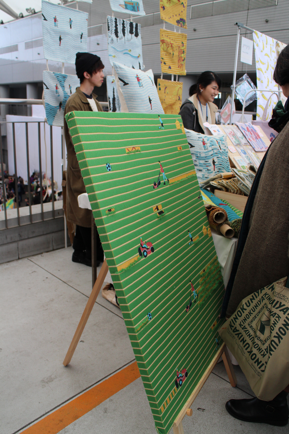 前々から気になっていた氷室友里さんも出店されていました.はさみでカットすることで後ろの模様が出てくる遊べるテキスタイルなんです.写真は芝刈りの模様です.