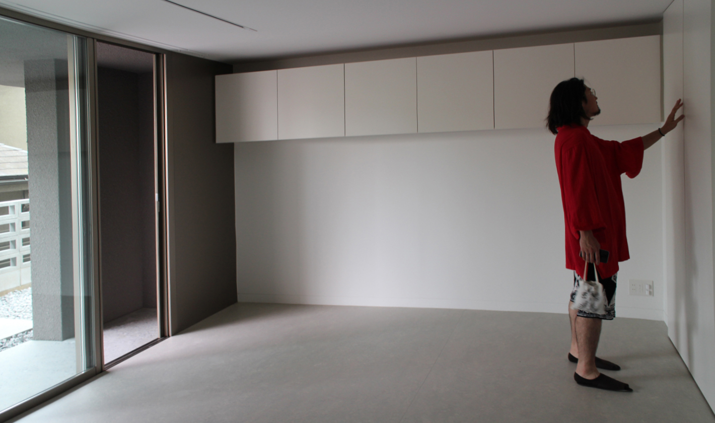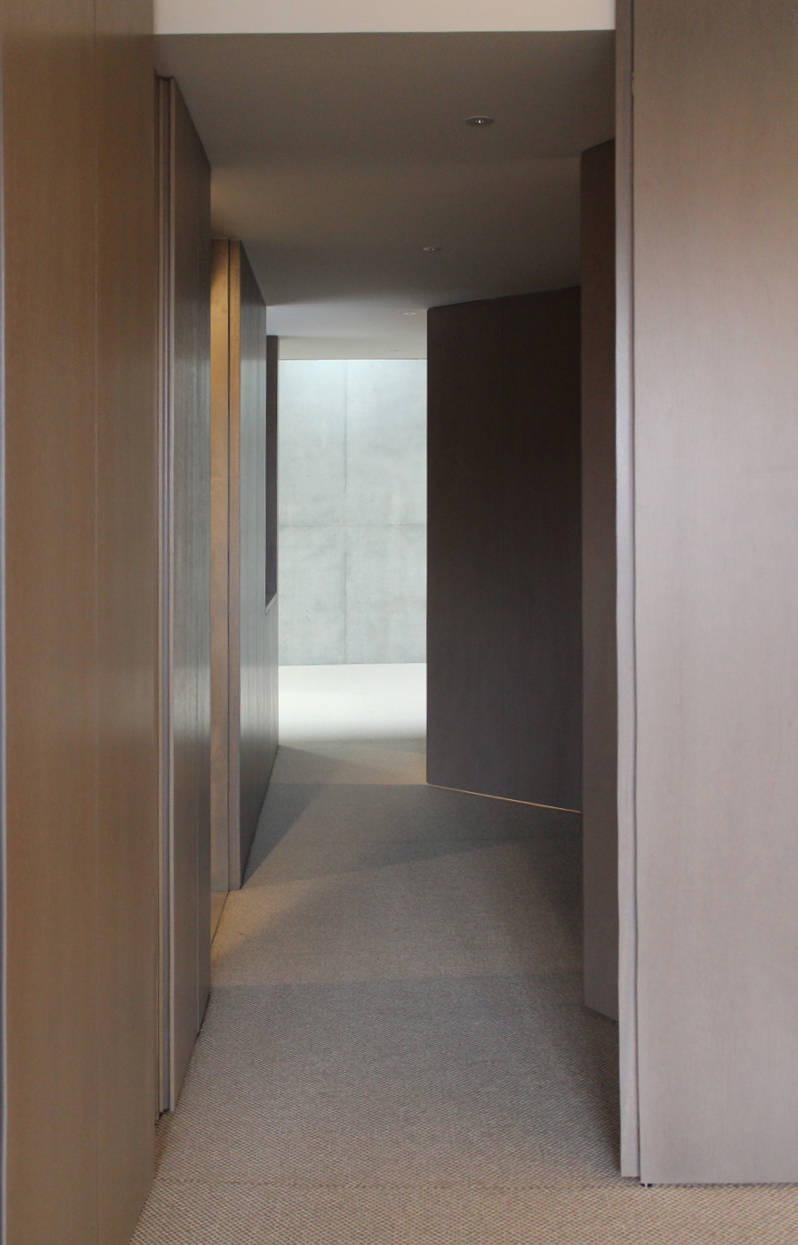 慣れるまで建具と収納の扉を間違えてしまいそうだなと思いましたが、廊下壁面が全て一定のパネル割りとなっているので、とても緊張感のある空間になっていました.