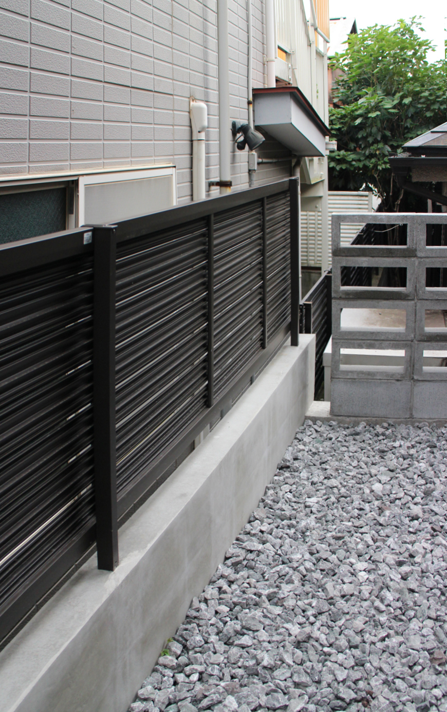 写真の左側の塀は、実は、設計した建築側の敷地で、わざと既製品を使い周囲の塀と合わせる事で、隣の敷地に属するように見せているそうです.