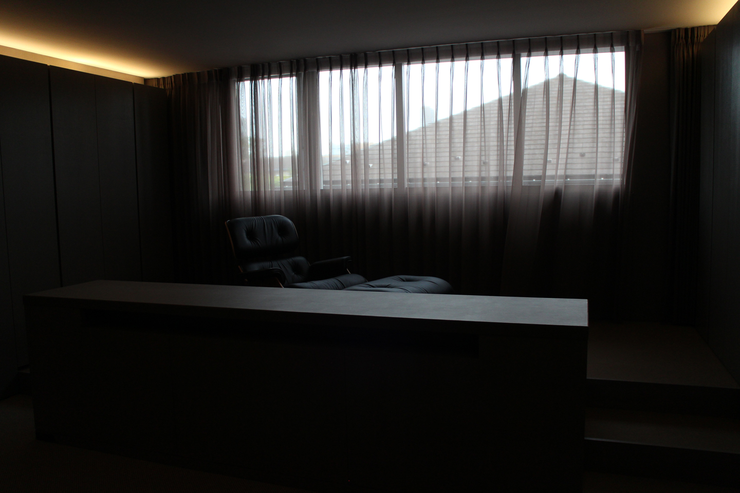 書斎と中央のホール空間は、すべてグレーブラウン色の建具または収納の扉となっていて、