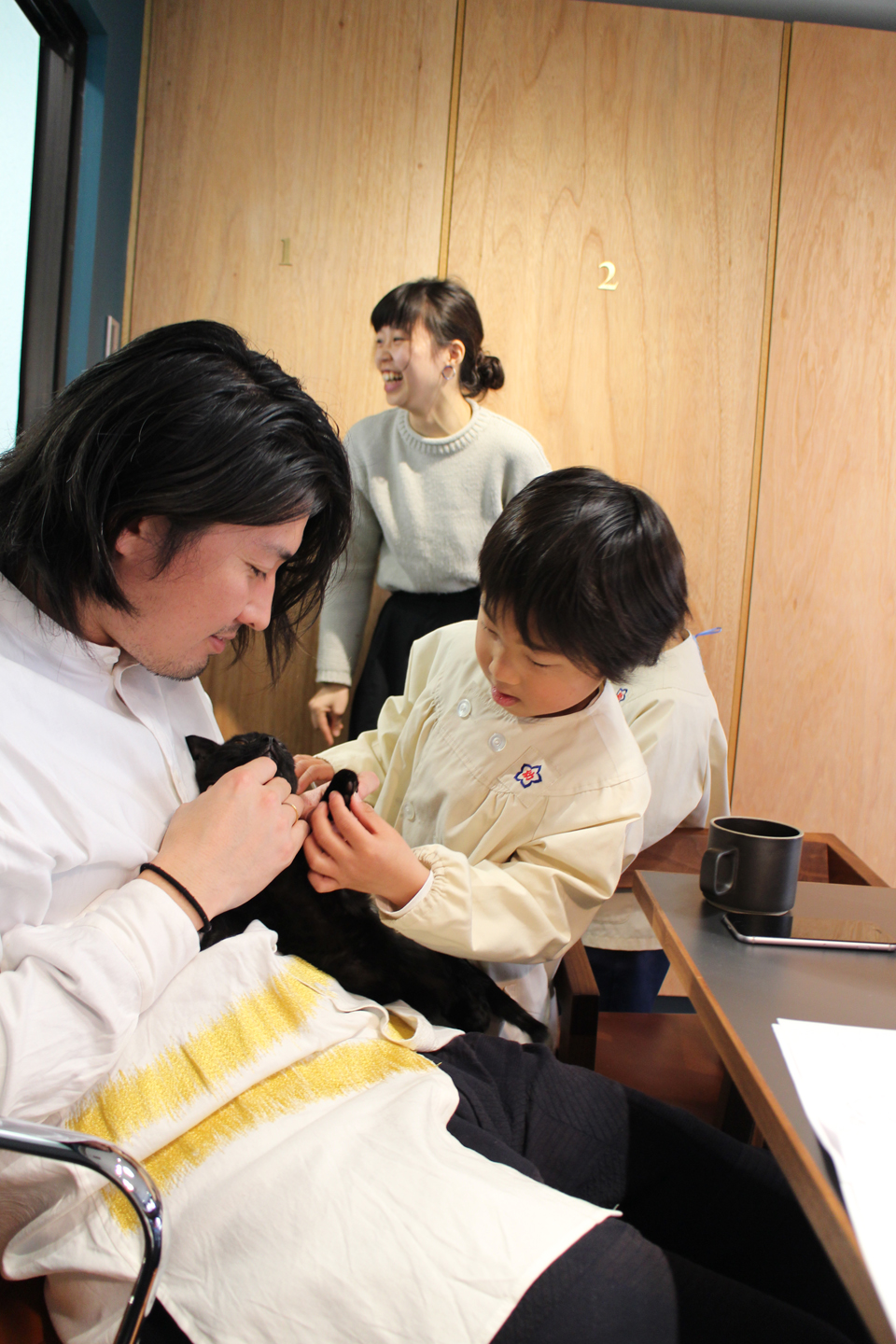 打ち合わせの途中に近所の子供達が猫に会いにオフィスに遊びにきました.