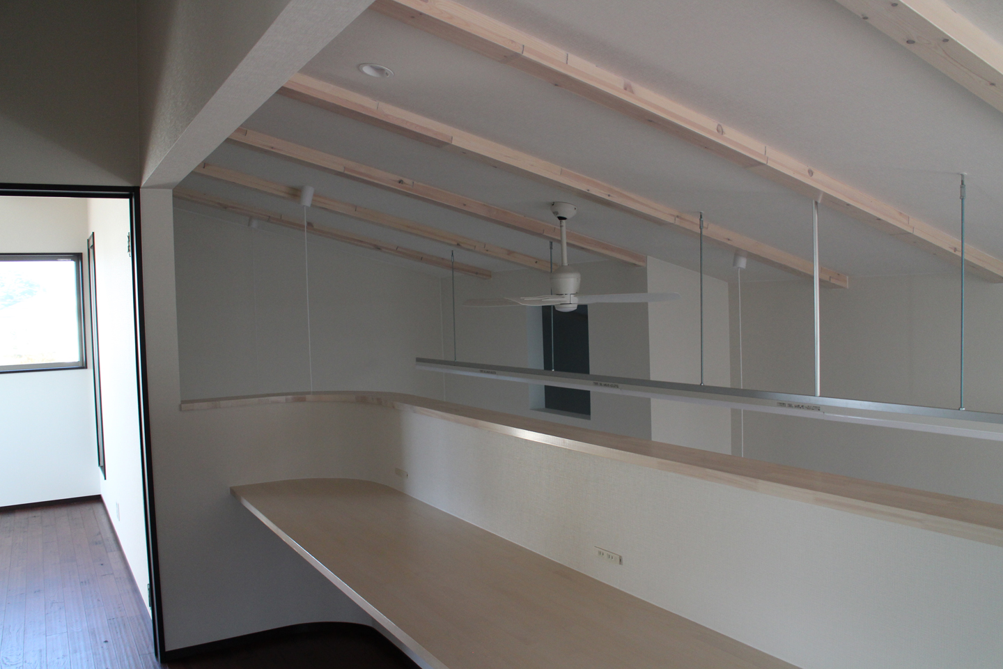 登り梁を現しにして、木目を残しながら薄く白化粧しています.