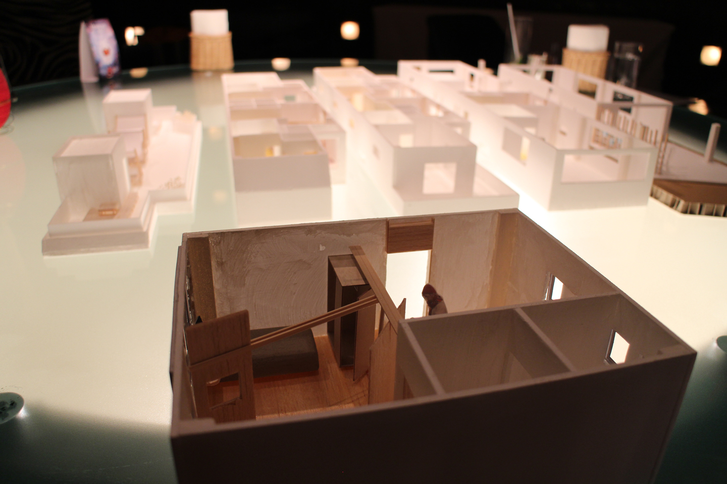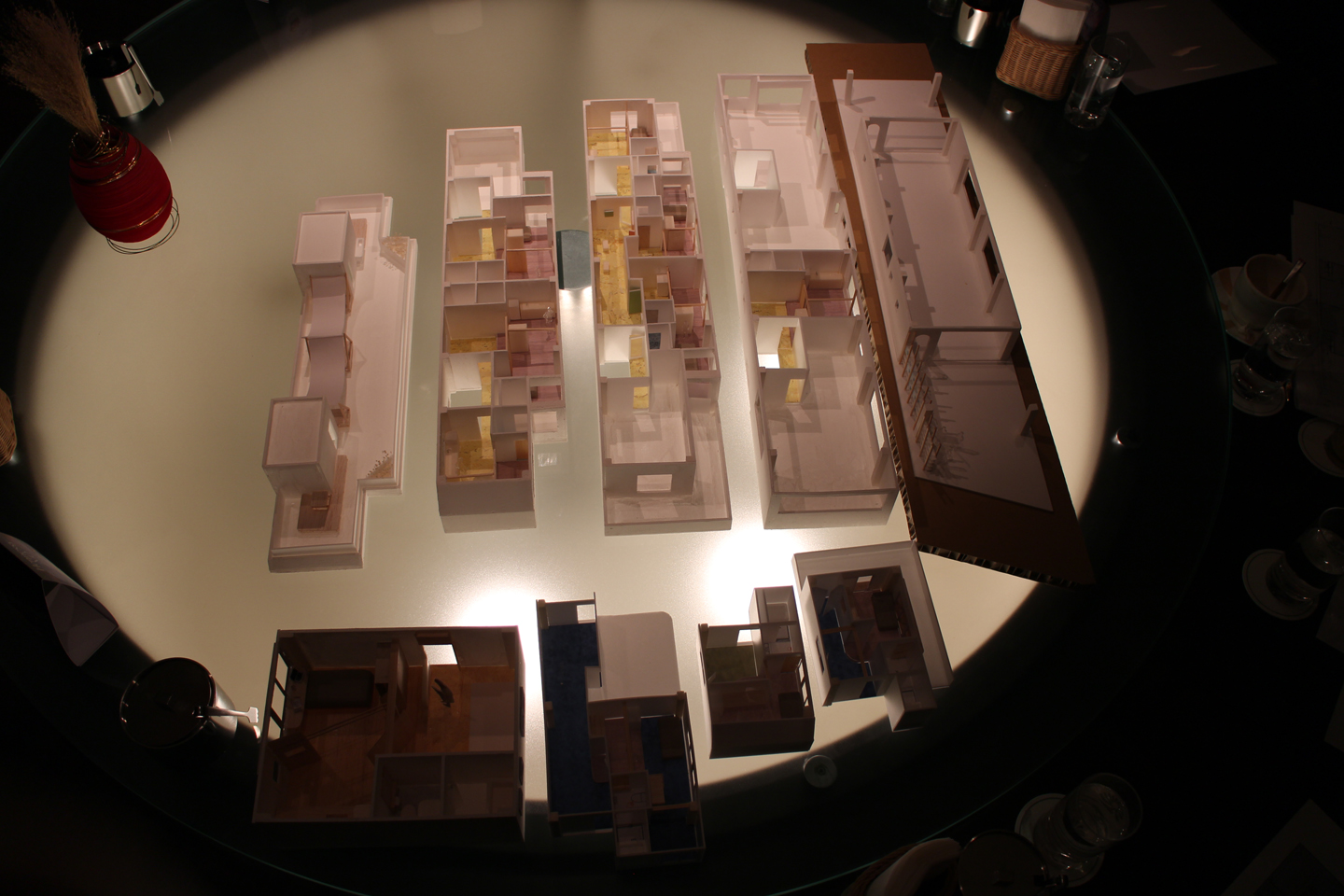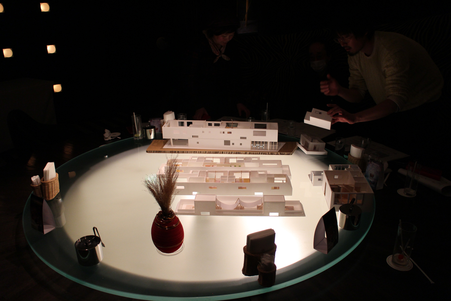 指定された打合せ場所が、ホテルモリノ新百合ヶ丘のラウンジで下から光る不思議な丸テーブルがあり、模型達がとてもムーディーに照らされていました.