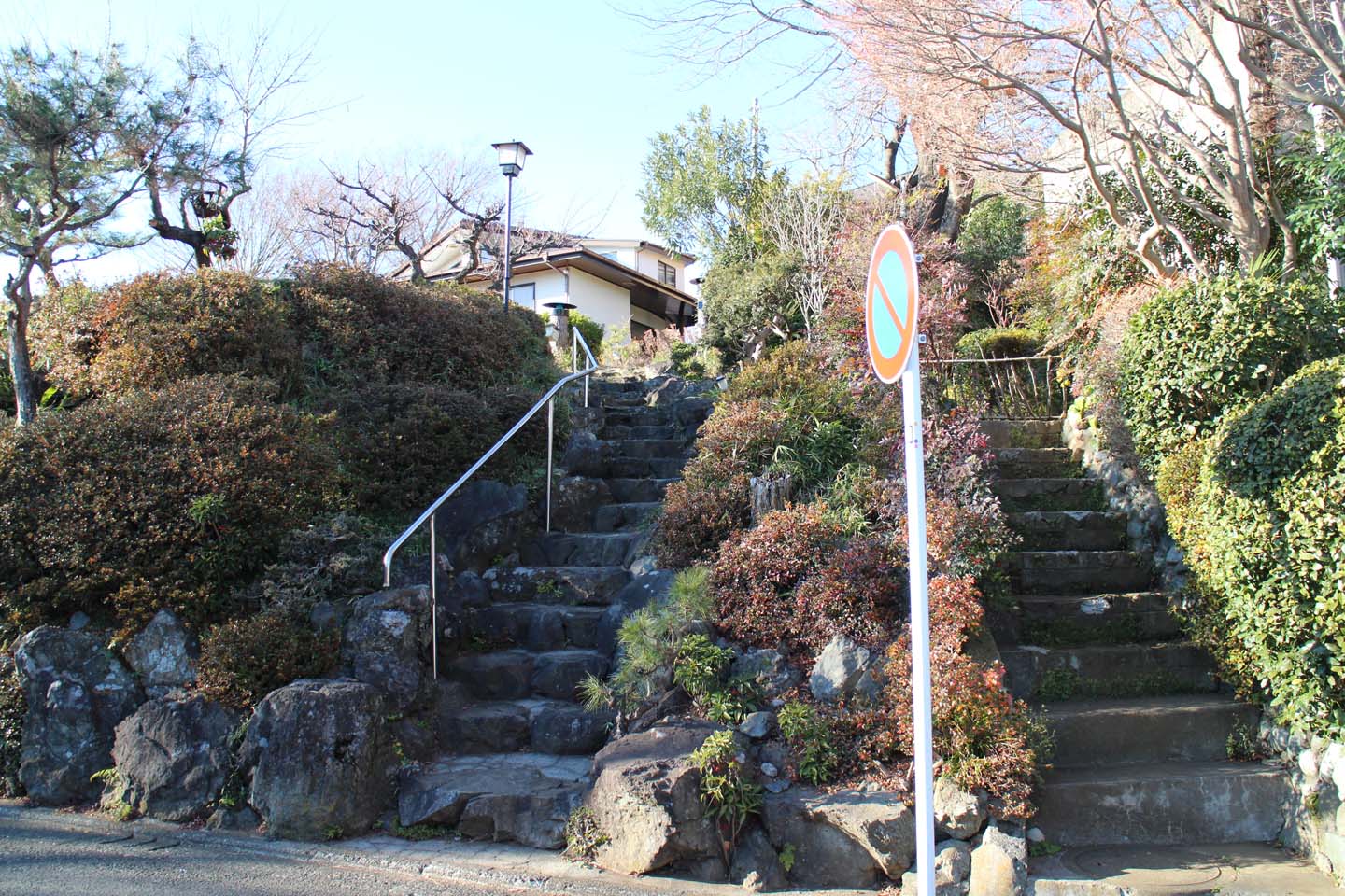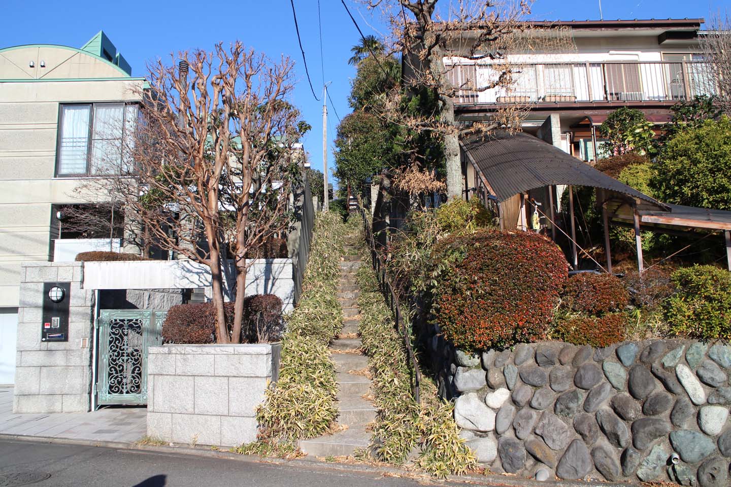 多くの家が道路より少し高い位置にあり、アプローチや段差部分の作り方がとても魅力的な街並みです.
