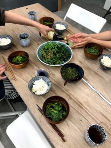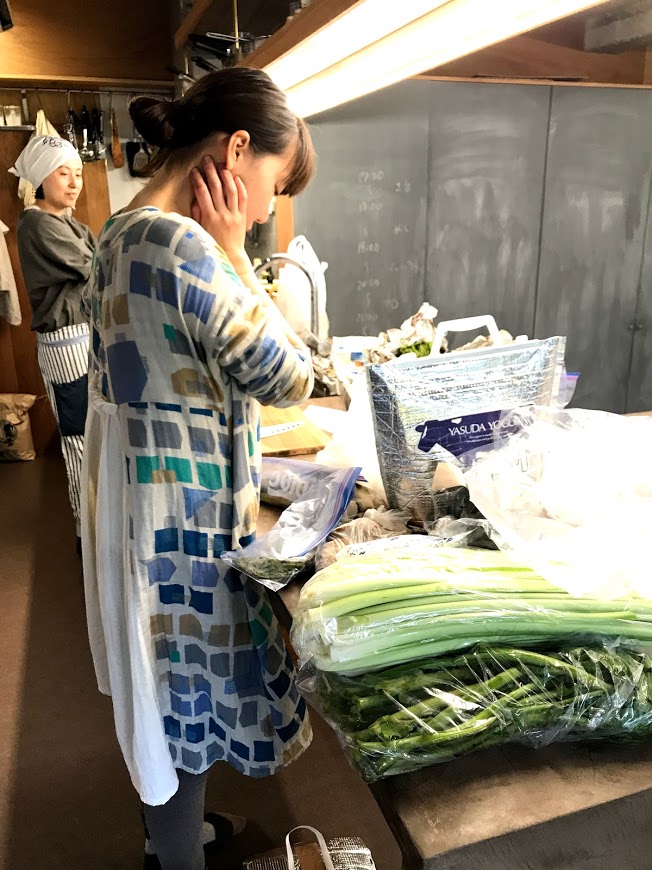 びっくりする事に、電車で大量の山菜(スーツケース一つ、大きいリュック一つ、大きいボストンバック一つ)を持ってきたそうです.5Fのキッチンを使って明日の仕込みです.夜ごはんも作って頂きました!山菜onlyの緑飯です!とても美味しかったです.