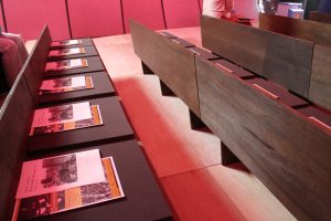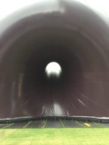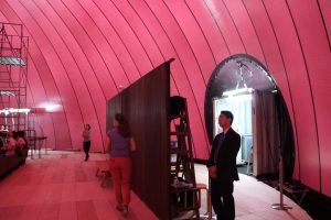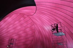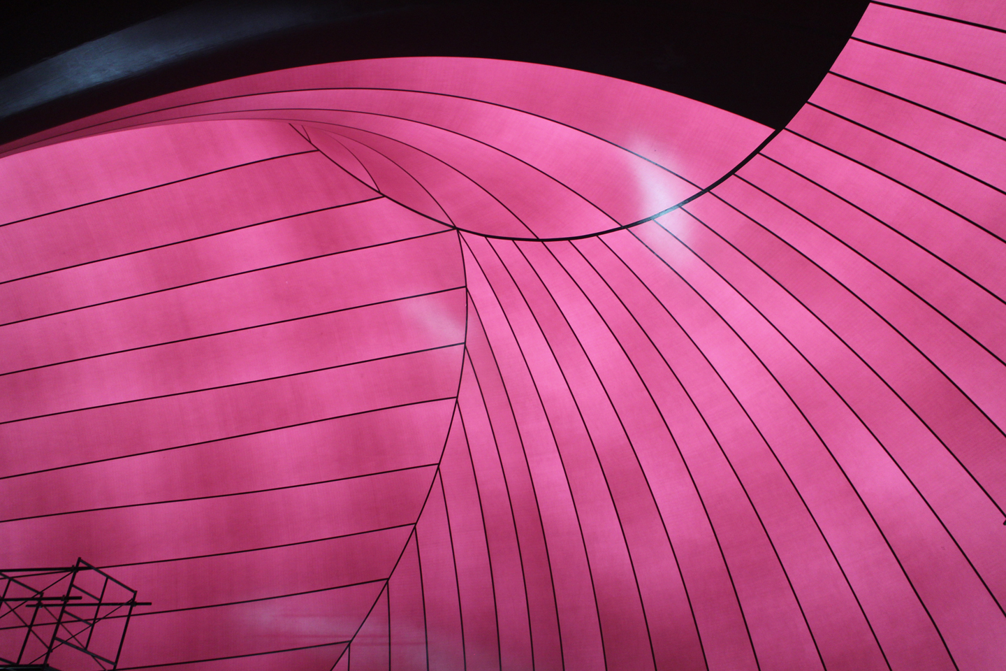 塩化ビニールでコーティングされたポリエステル製の膜が1時間ほどの送風でドーム状に膨らみ494名収容できる巨大なホールになります.内部空間は圧巻です!外部の光がピンク色の空間に包まれます.