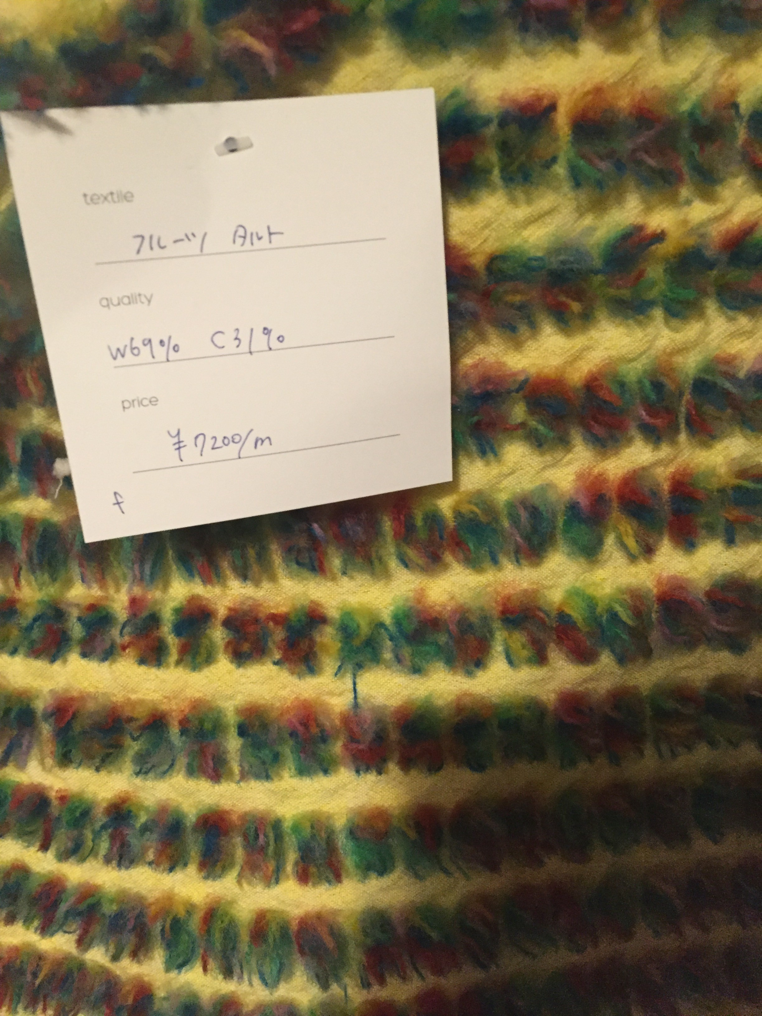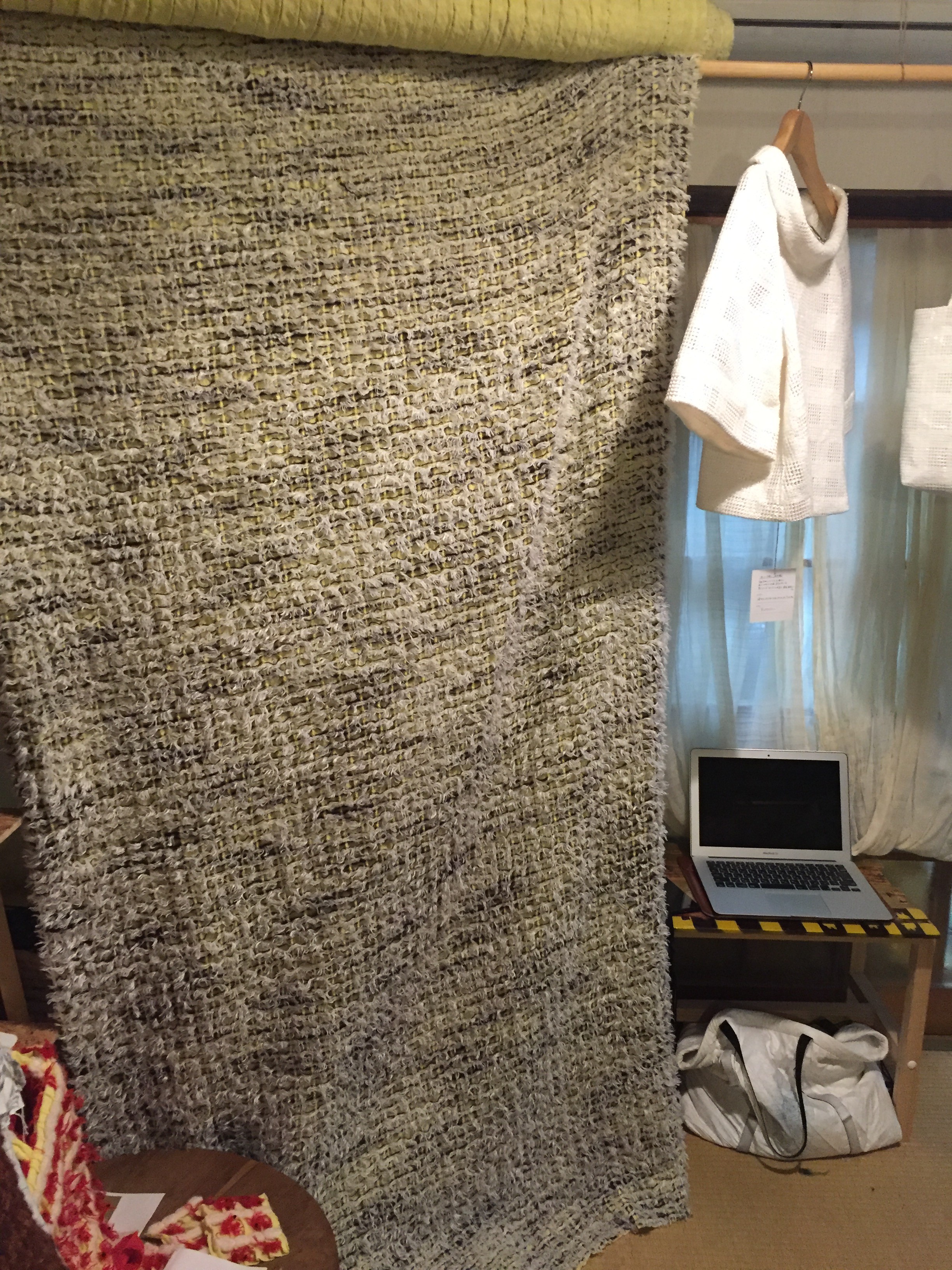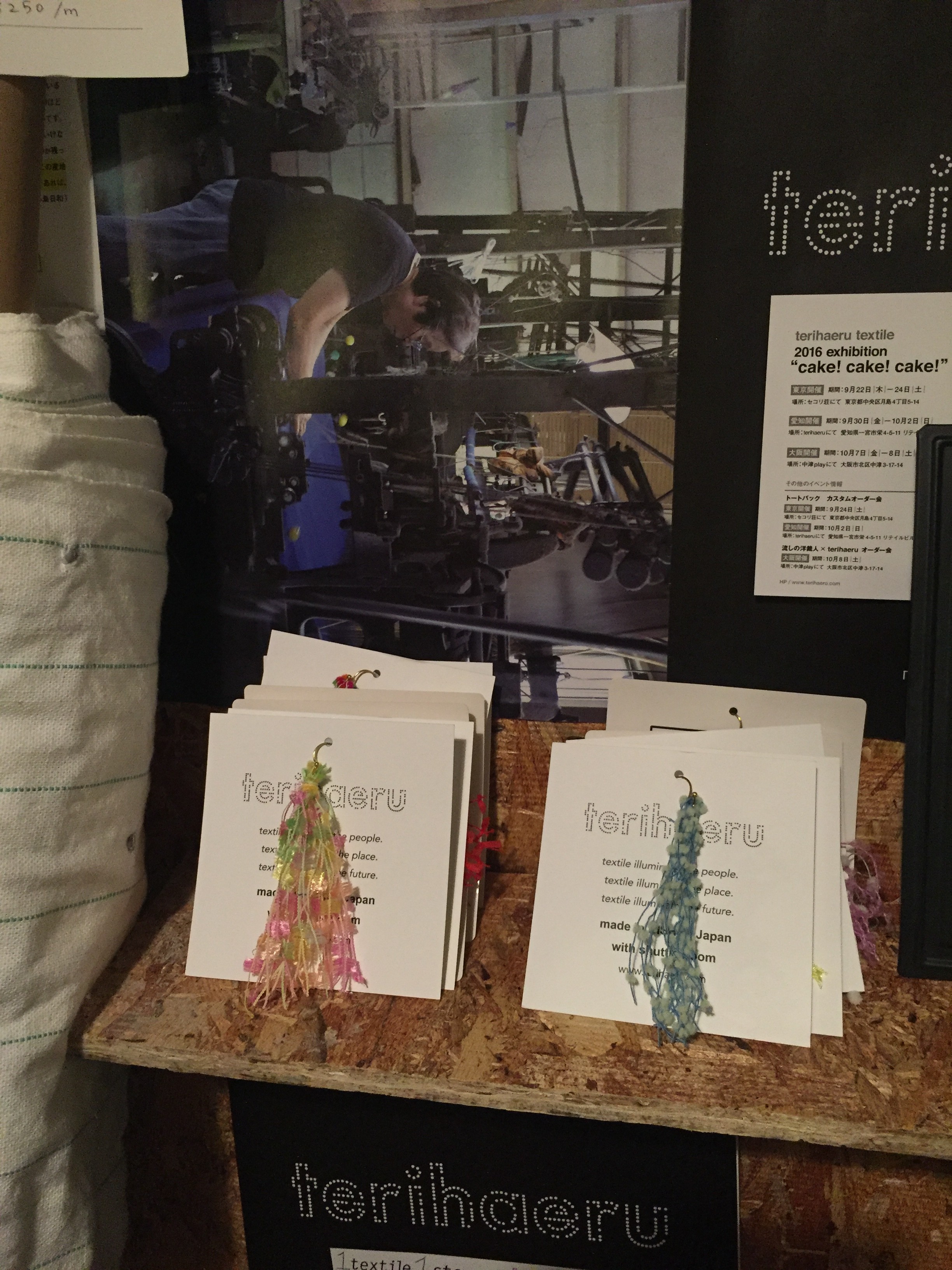 抹茶ケーキにフルーツタルト、白玉あずきです.どれも立体的で、これは生地なのか、、、?と思えるものばかりで、とても興味深いです.またこれからの季節にとっても暖かそうだなーと思ったり.生地を見ながら、5つの床プロジェクト の事や機屋さんの事等たくさんのお話をしました.