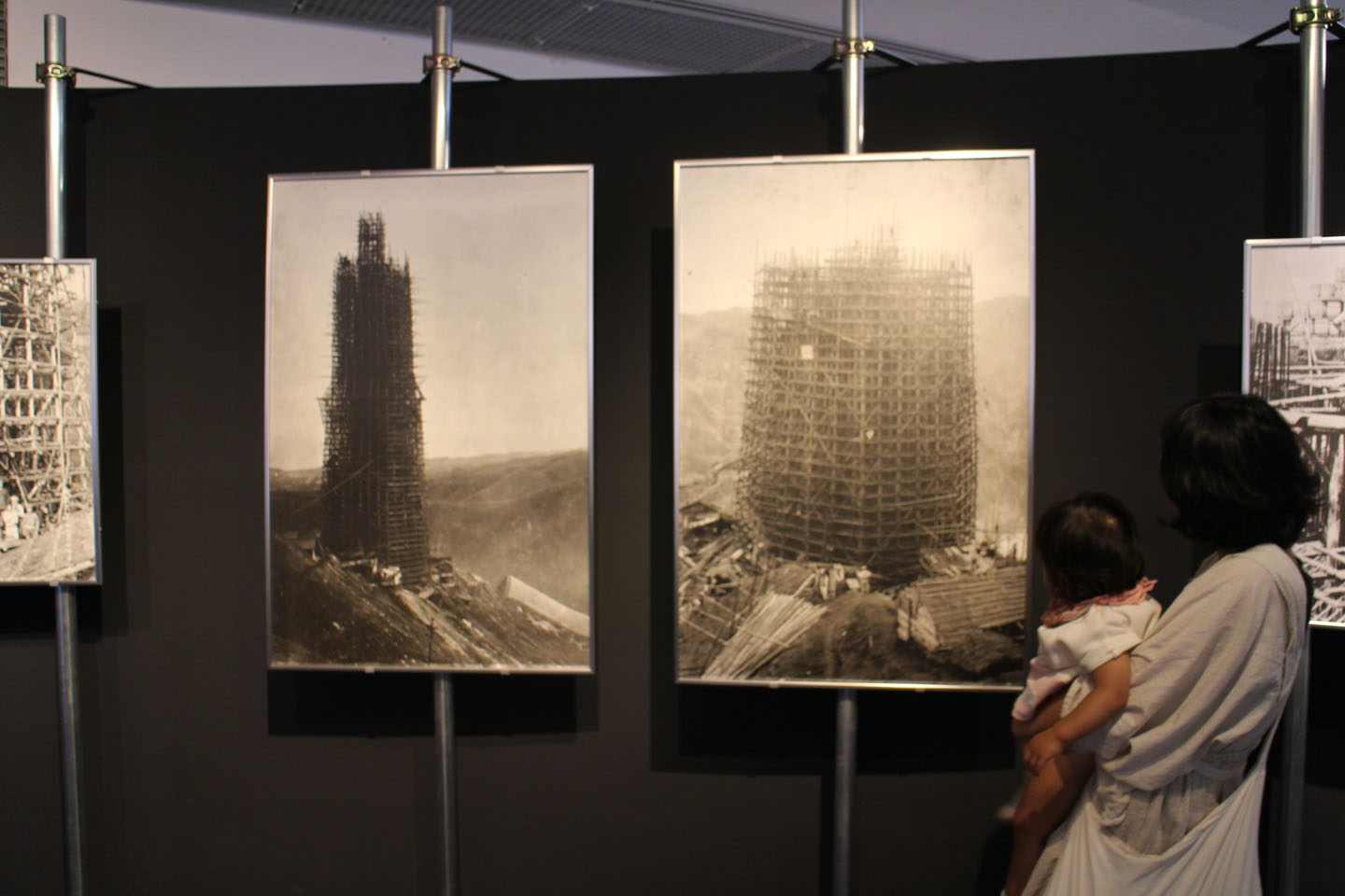 銅製錬によって発生する亜硫酸ガスが原因で周辺の山々が荒れていた時代があったそうです.その煙害問題の解決に向けて作られた世界一高い大煙突「日立の大煙突」が建っていた当時の大迫力の写真と建設中の写真.足場がかかる建設中の写真も迫力があります.