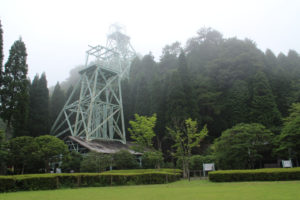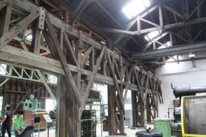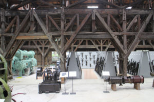 今回一番大興奮だったのがこちら.鉱山資料館の構造!第二次世界大戦中の1944年に建てられた木造のコンプレッサー室をそのまま展示室として活用しています.戦略物資としての金属資源の確保と増産のため削岩機の動力源をつくるコンプレッサーの強化を迫られて建築したそうです.当時は鉄骨材が不足していたため鉄骨の代わりに木造で建てられています.起動機走行用の枠を鉄骨に変えて木造で作っているので、鉄骨と同程度の強度を得る木造を苦心の末作った結果がこの力強い構造を生み出しています.
