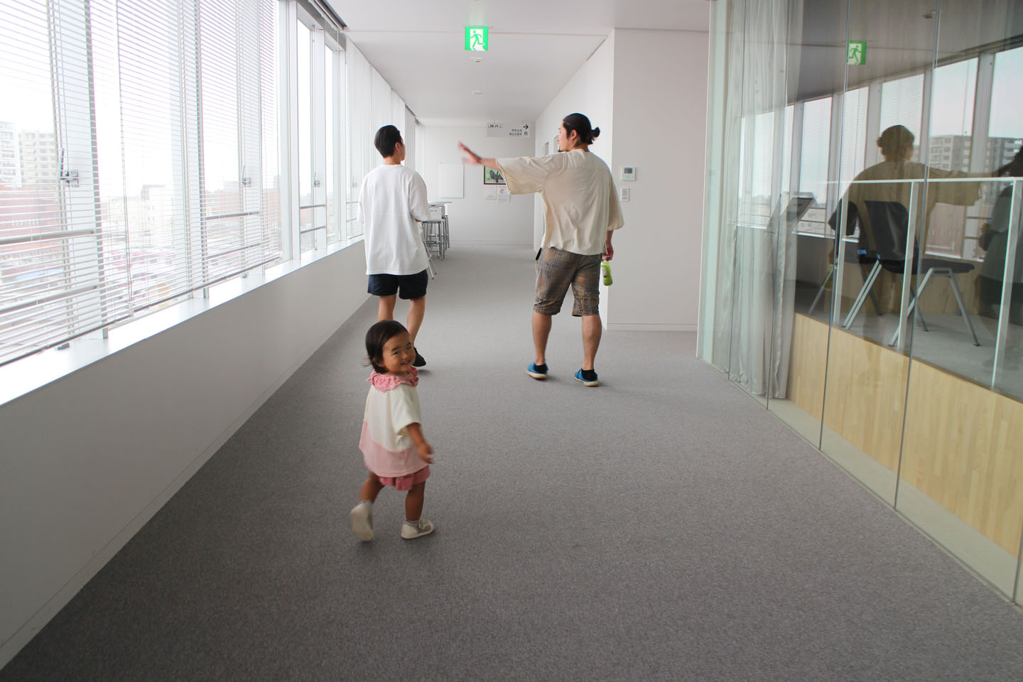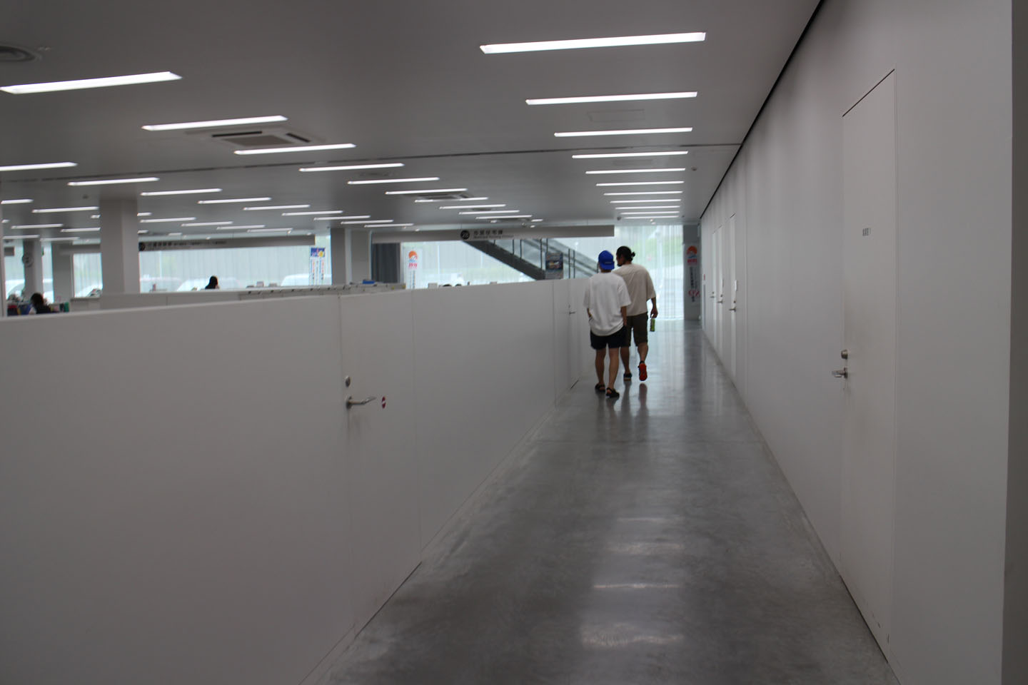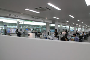 1Fはぐるっと回れて、執務スペースとの境に肩ぐらいの高さの壁で隔てているので、前を向くと白いすっきりとした空間、横を見るとお仕事している様子が一望できます.多くの役所は暗く、じめっとした印象の場所が多いので、白くて清潔感のある空間は良いですね.