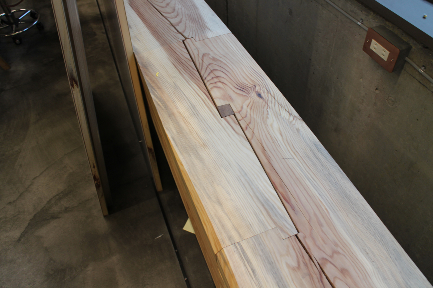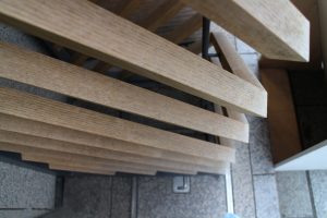 壁際にもどどんと大きな角材が腰掛けとしてそのまま設置されています.非常階段からギリギリ搬入可能な長さで計画し、現場で追掛け大栓継ぎを行ったそうです.