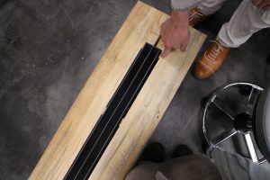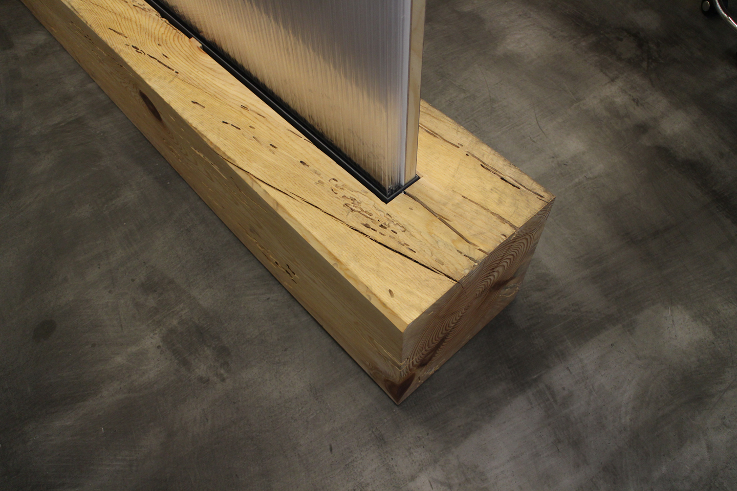 ベースに使われているのは、日本家屋の大黒柱として使われる一辺が一尺(約30cm)のマツの無垢角材をそのまま使用しています.中央の溝にパネルを差し込みます.
