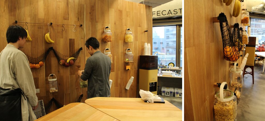 中央の壁には、「壁継」という木造建築の継ぎ手を利用したプロダクト.