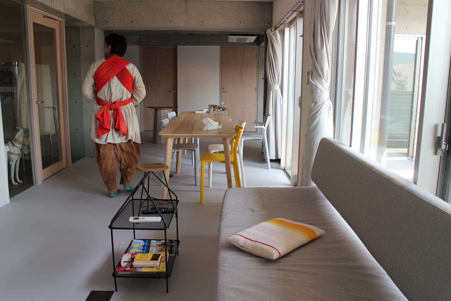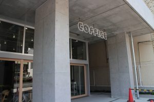 本日は、娘の八衣も一緒に来ています.生後1か月にして北山建築を体験するという贅沢です.建築の英才教育ですね.地下1階にカラオケバー、1階はカフェバー、2階はフィットネスの店舗が入っていて、3階~8階が賃貸になっています.その内3階~6階の4フロアは、事務所と15㎡~21㎡程度の部屋が並ぶシェアハウス、7階と8階は100㎡程度の広い部屋で、そこではペット飼育も可能だそうです.1Fはオープンが遅れていて、まだ準備中だそうです.