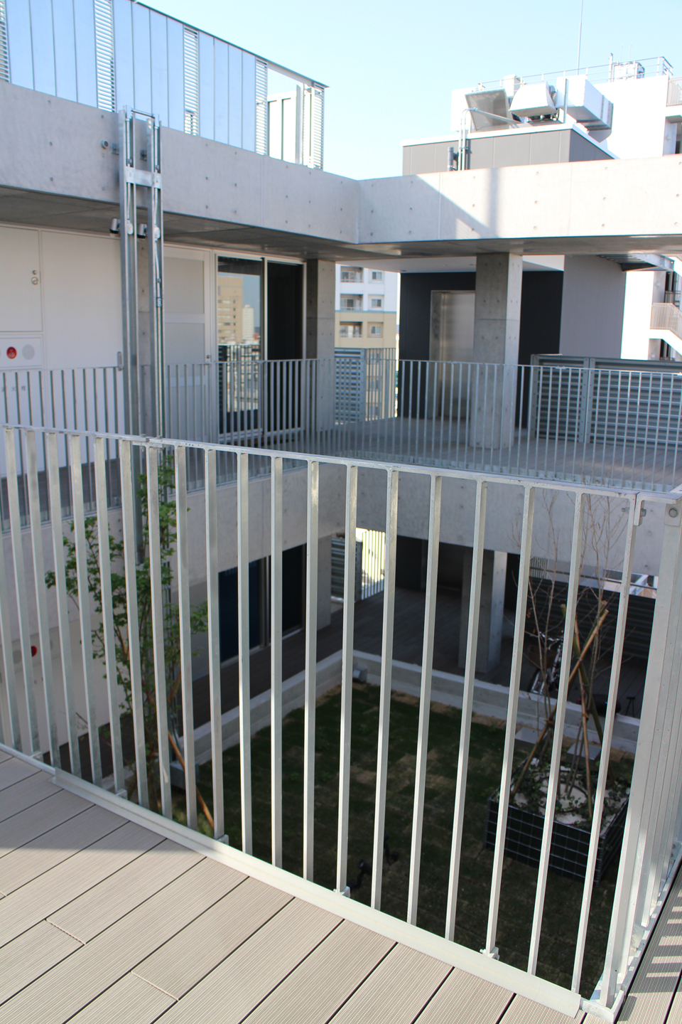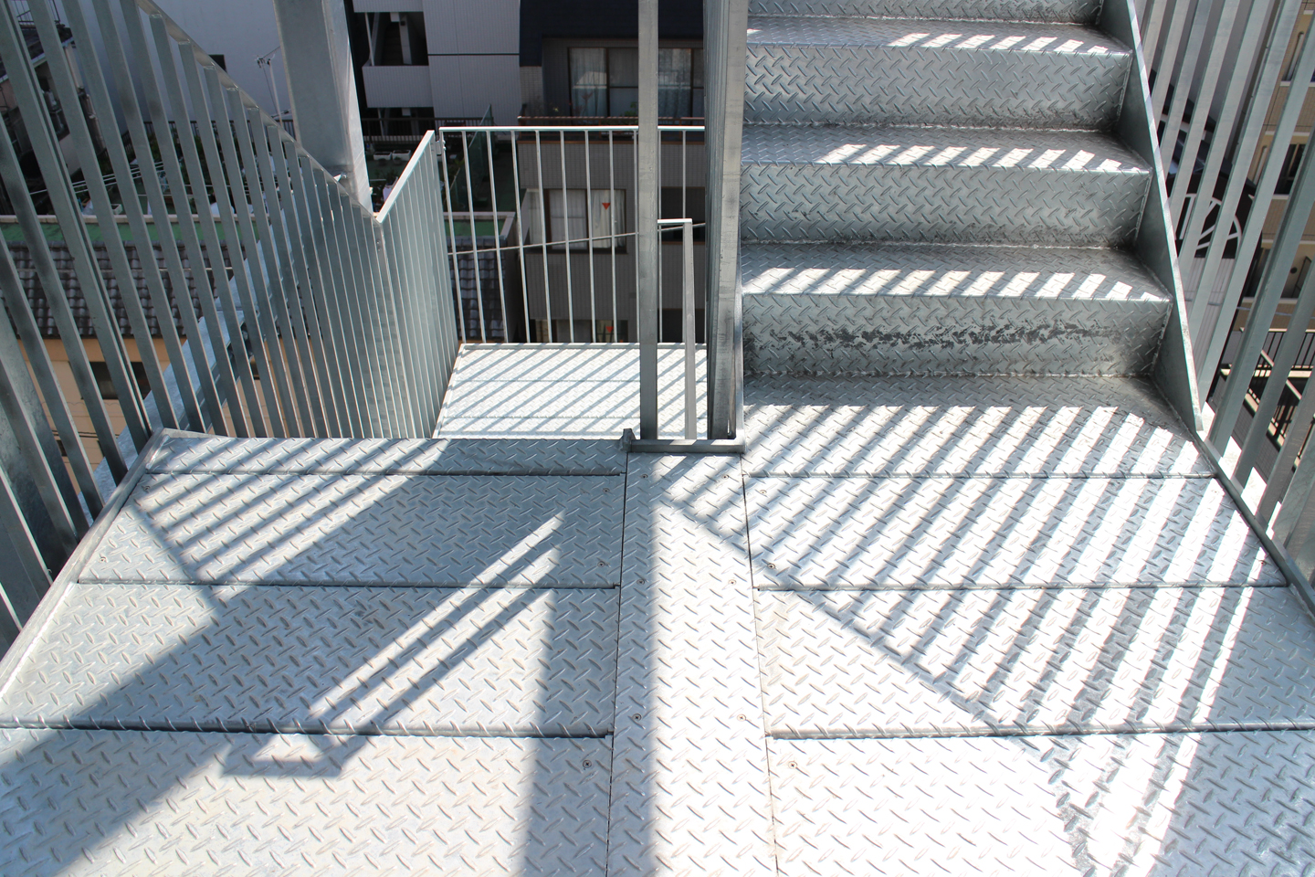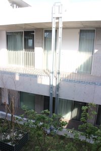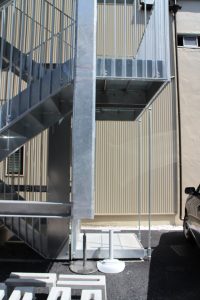 建物自体は免振構造になっていて、この屋外階段、地面についていると思いきや、微妙に浮いています.