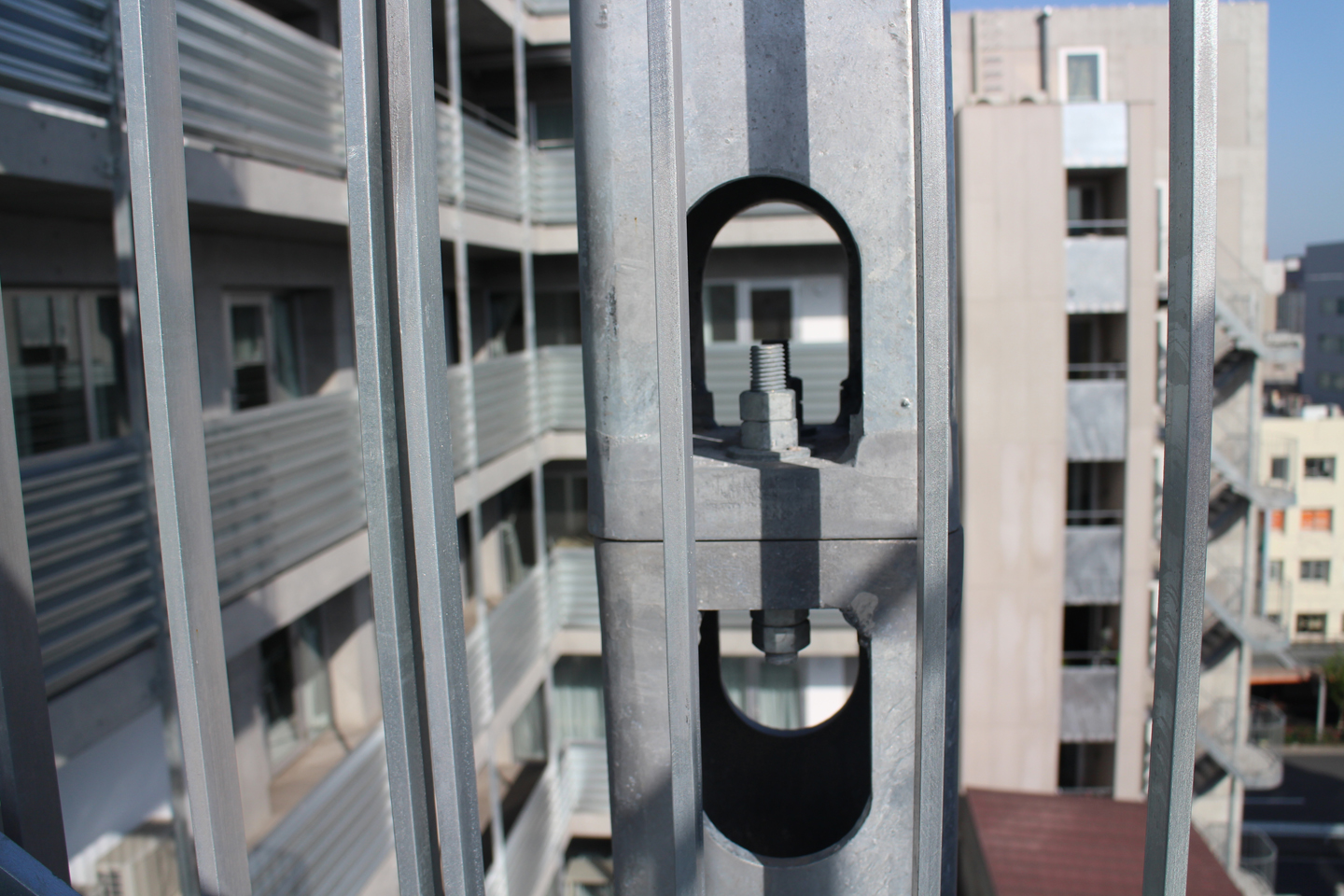 屋外階段の鉄骨柱の接合は、溶接でなくアーチ状に穴を開けて上下のボルトで接続しています.
