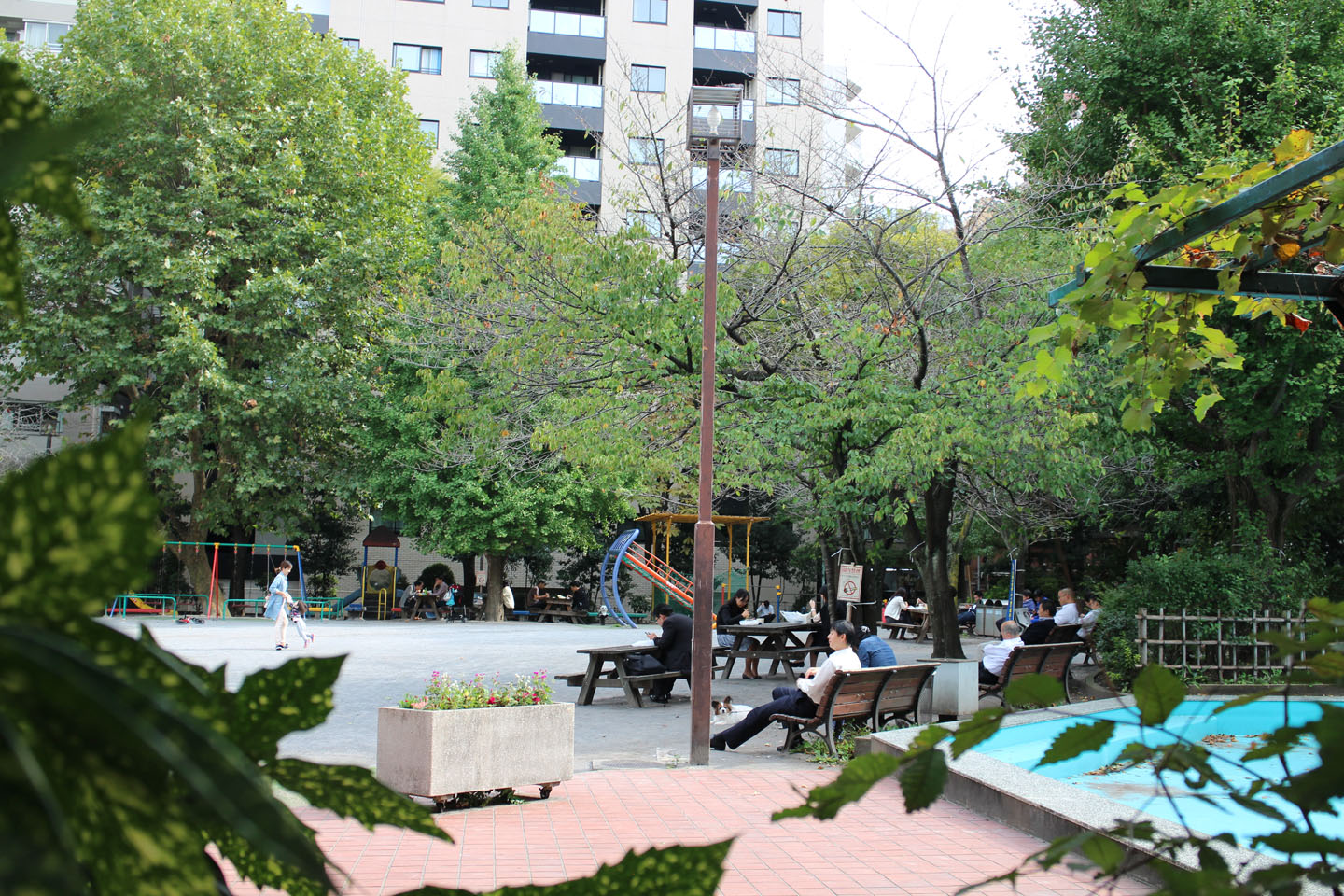 そしてビルの向かいにはもうひとつ、公園があります.たくさんの緑があり、子供から学生、サラリーマン、おじいちゃん、おばあちゃんがそれぞれの時間を過ごしています.向かいに小学校と公園があるという立地にとても魅力を感じました.