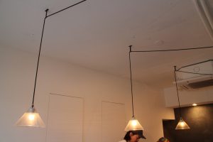 開店前から人が並んでいて、お店の全体像を撮影する事ができなかったのですが、床から壁沿いを通り、おはぎの台へ三つのペンダントが照らすというとてもシンプルなんですが、その形式がとってもかっこいんです.
