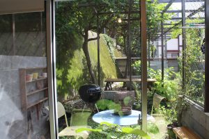 リビング空間が裏庭に繋がっています.コンクリートブロックと上のフレームがいい場所を作っていて、とても気持ちのいい空間でした.ここで暮らして商店街のオフィスで働くというとても豊かな生活が想像できました.