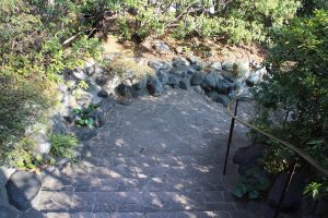 アプローチは緩やかに折り返し、その先にお店から連続する屋根と大きな暖簾が待ち構えています.