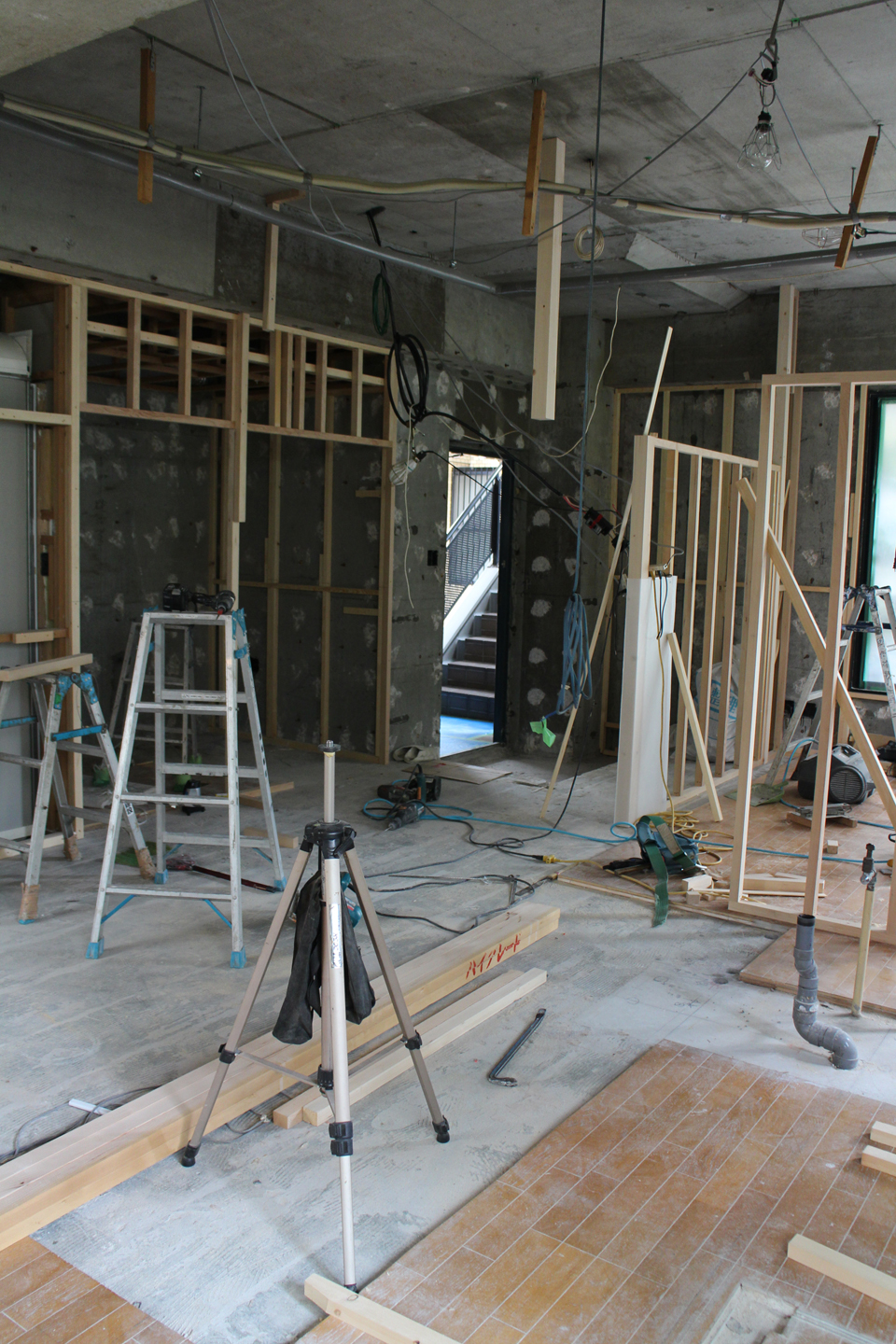 次に5つの床プロジェクトの現場へ、大工の後藤さんが今回の現場はメインで施工してくれるそうです.現在、現場は壁の下地が少しずつ立っている状態になっていました.