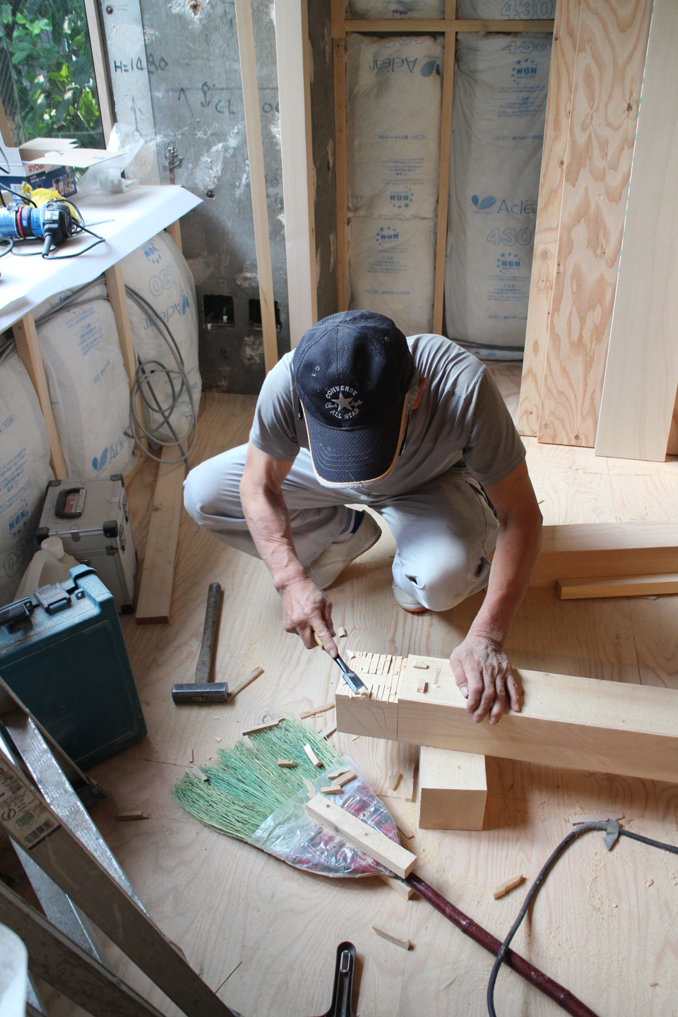 こちらでは、床大引に丸のこで切り込みを入れ、ノミで削っています.立ち上がりの柱と綺麗に噛みあわせていました.