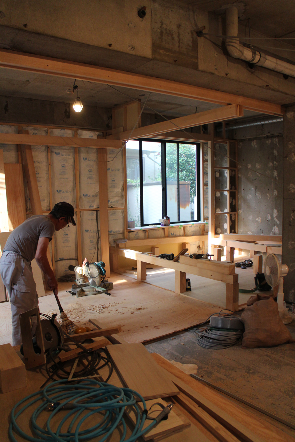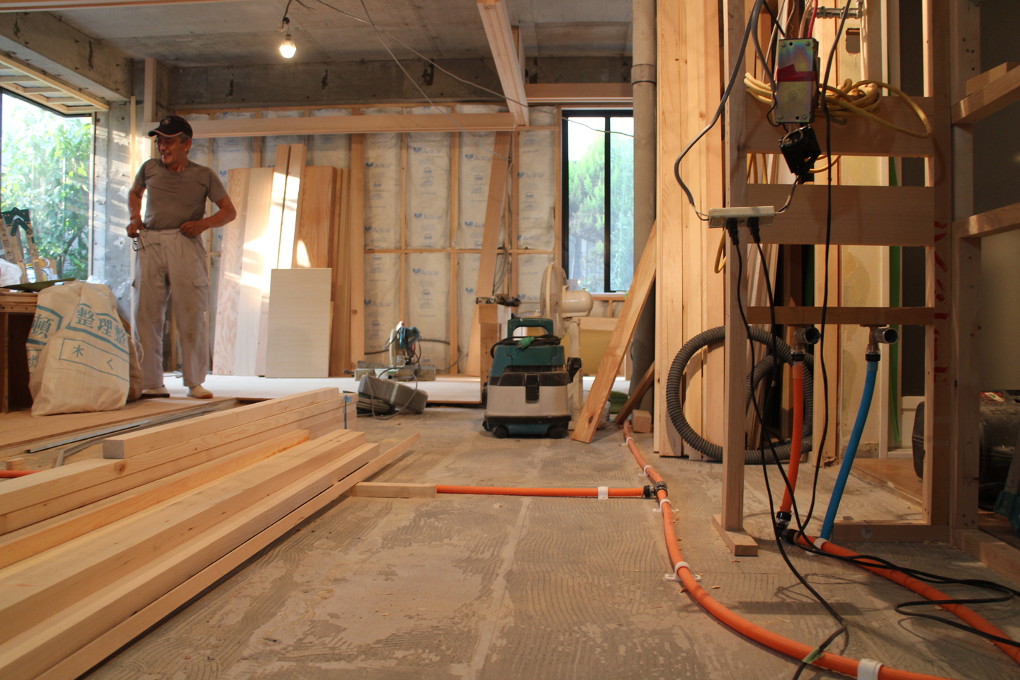 本日は大工の後藤さんと電気のトヤマさんが現場で作業していました.後藤さんは、小上がりの部分の床組を作っていました.後藤さんとは、各所電気、照明の確認をしてきました.ペンダントと玄関照明はまだまだ検討が必要そうです、、、、.