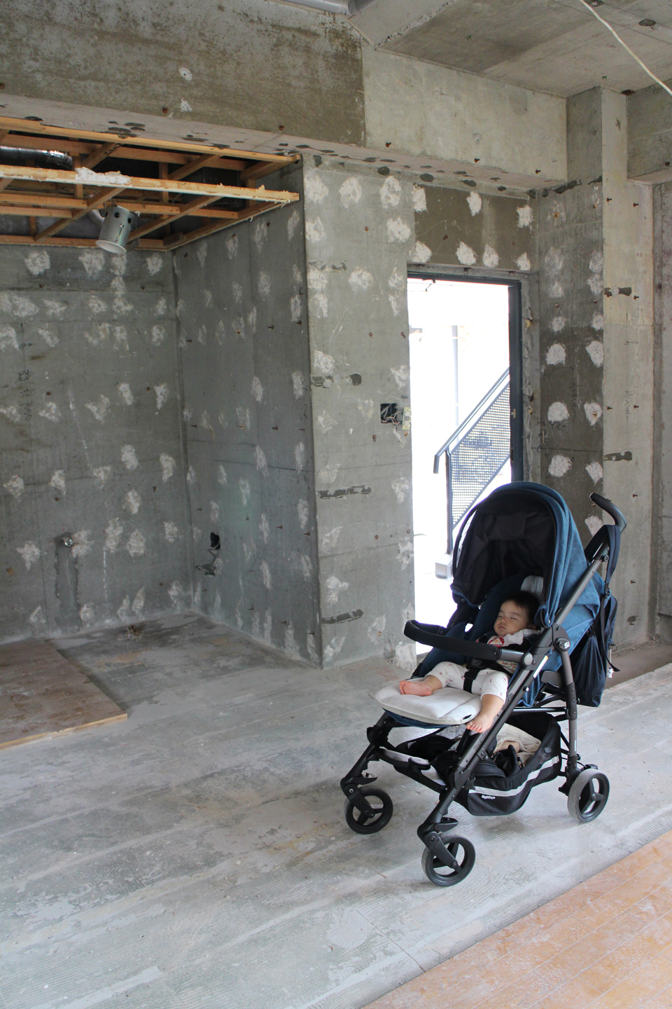 そして少し遅れて、現場に未千ちゃんも登場です!躯体状態の現場とベビーカー、、、なんとも異様な景色です.