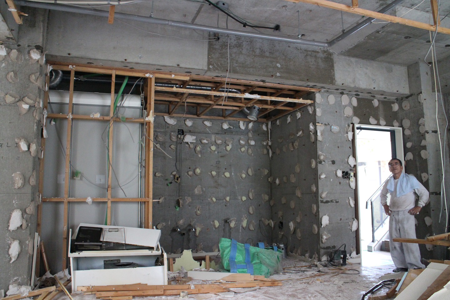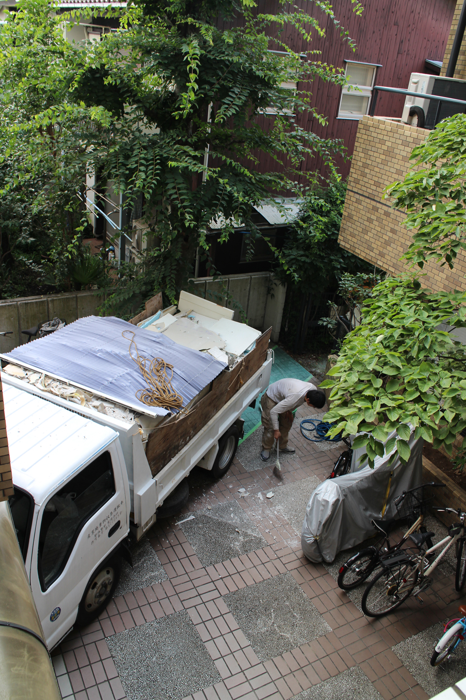 私が現場に到着した時には、トラックにたくさんのプラスターボードの破片が積まれていて、兄は共用部の掃除をしていました.