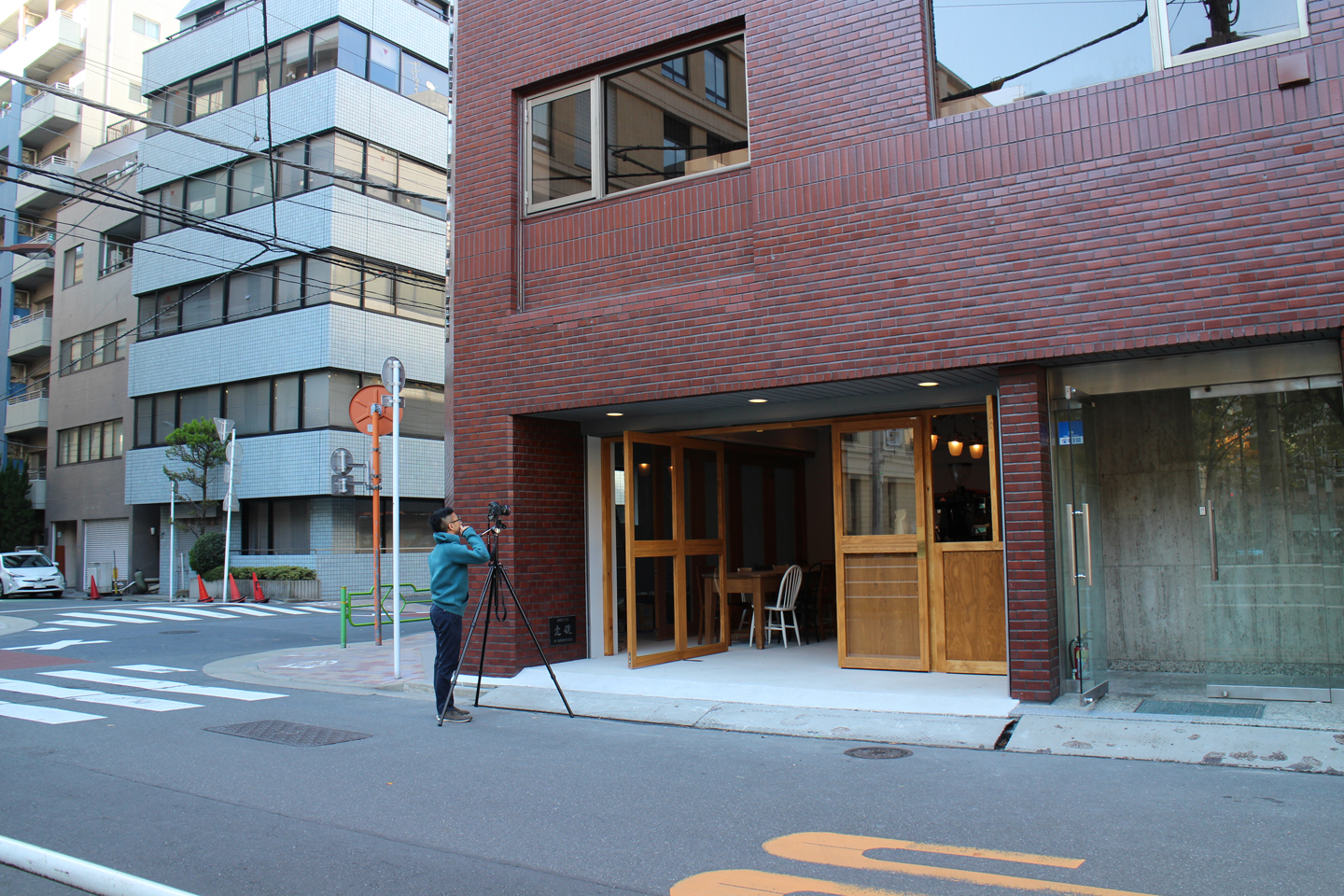 10時過ぎからは、1Fの撮影を3Fの大塚君にお願いしました.入口の扉は、閉まっているときは、5枚の扉のように見えますが、左の2枚に見えるものが大きな回転扉で真ん中が180度開く扉になっています.一番右側は、上部が開き、TOGOカウンターになります.