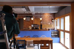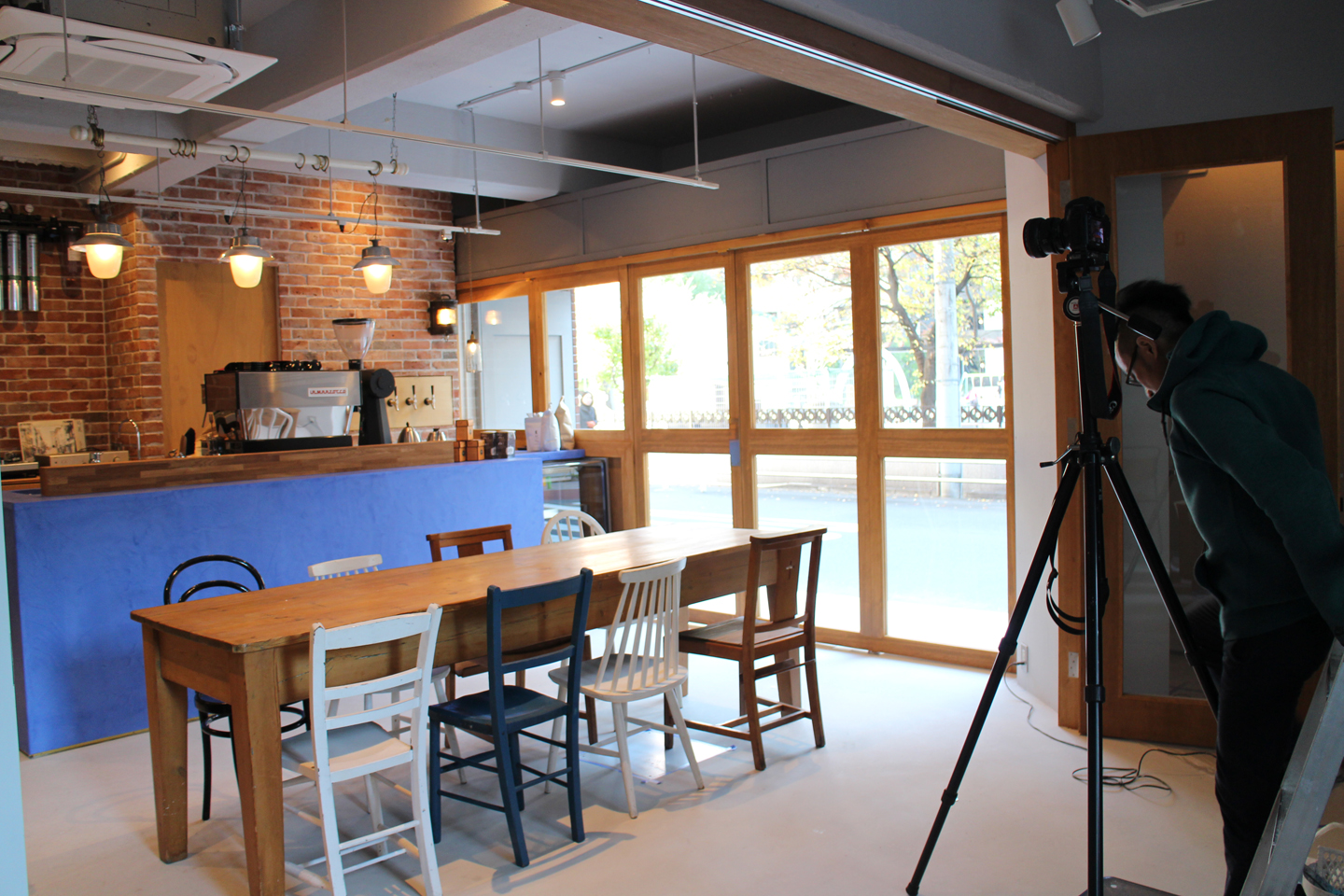 ギャラリーはまだ少し塗装のグッツが残っているので、お店側を撮影.少しずつ、Sunday Morning Coffee さんが用意した家具や照明がお見せに搬入され、1Fがお店らしくなってきて、道行く人が興味津々に覗いていってくれるようになりました.