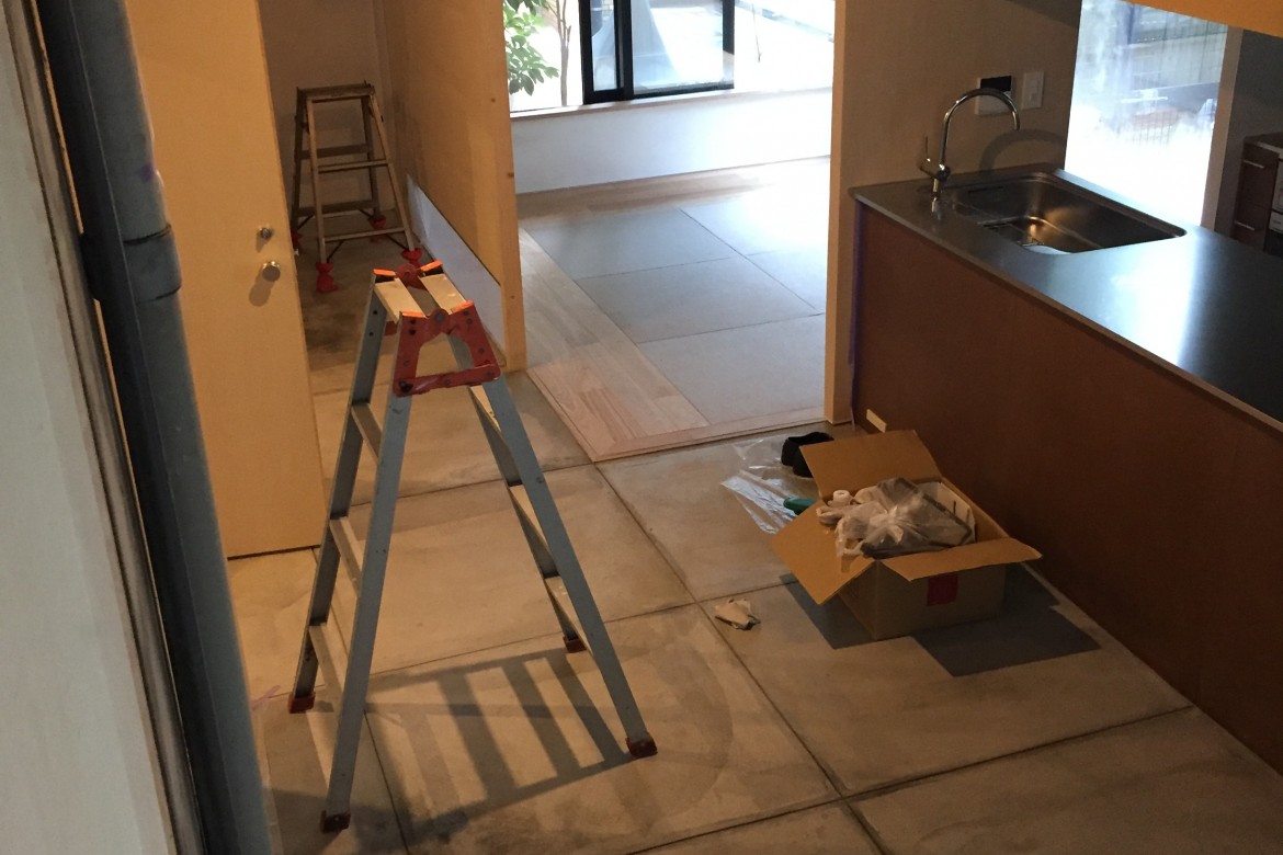 本日は夕方から、5つの床プロジェクト の施主検査でした. お施主さん、現場監督、設計の3者で現場を周りながら仕上がりをチェックしていきます.ハンガーラックの高さやモルタル補修箇所を確認したり、吊り戸棚