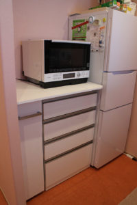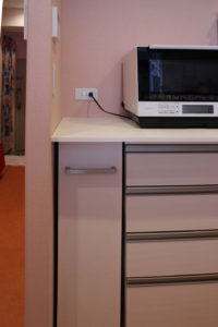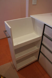 おばあ様が持っていた引き出し式の家具(写真右)と壁の間に出来た220mm程の小さな隙間.そこにぴったりはまるキャスター付きの家具を作りました.綺麗に納まるかなと少し心配していましたが、見事にぴったりはまりました.