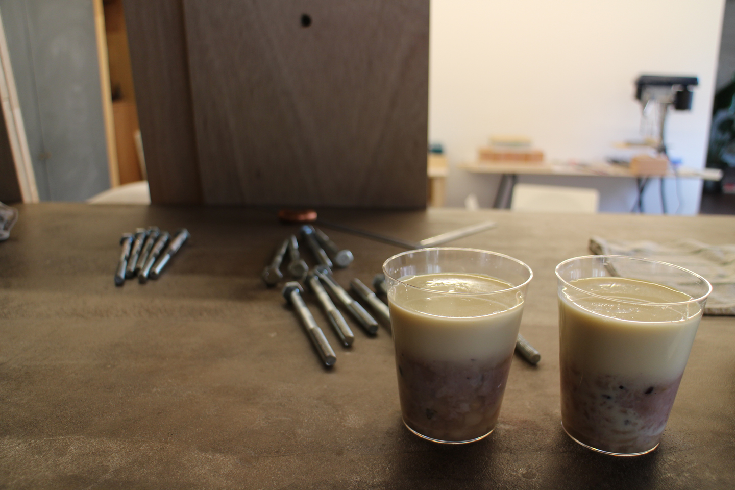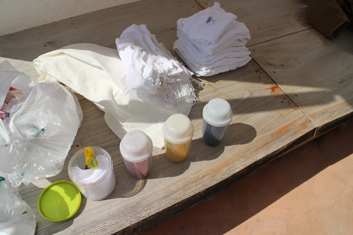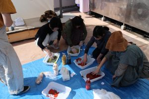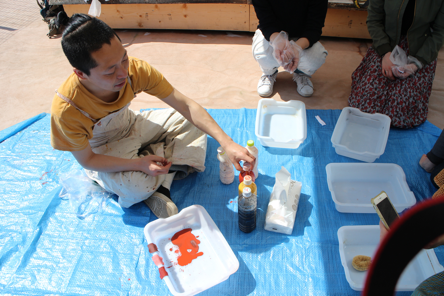 参加者の皆さんそれぞれ思い思いに色を調合していきます.お昼はパエリア、おやつタイムに豆と甘酒のおやつも位部さんが企画したそうで、我々にも分けて頂きました.
