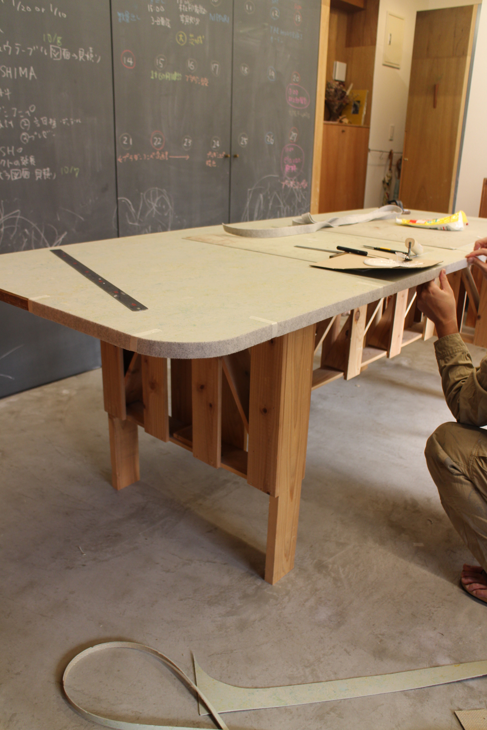 そのリノリウムを打合せテーブルの天板に設置しました.