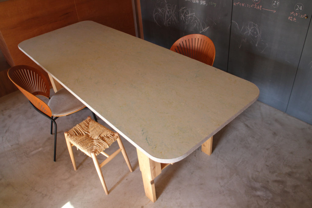 まずは打合せテーブルのリメイク.HOUSEM&Lの現場に転がっていたリノリウムの端材(リノリウムはどんなに少量でもロールでしか発注できないので、、、、)を監督に確認したら廃棄するとの事だったので、一部を引き受けました.