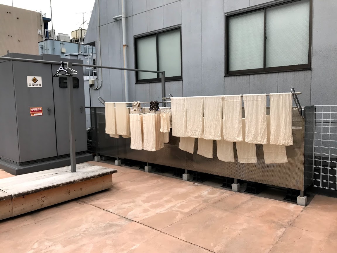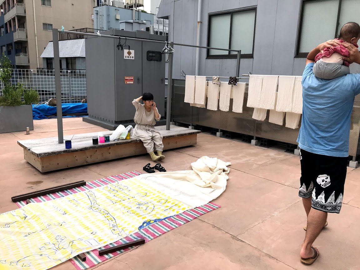 洗濯風景だけでテンションあがります.洗濯の横で中井さんは布に絵を描いています.
