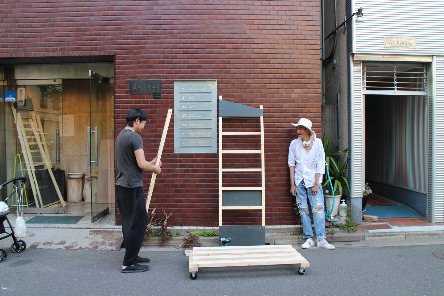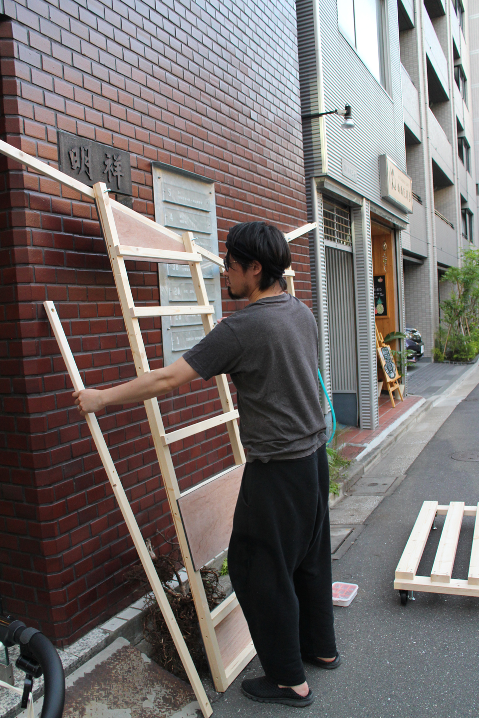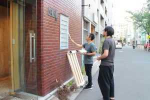 3FSAKAさんは夜の入居者会議に向けて表札に設置する「OPEN」サインをスタディ中です.