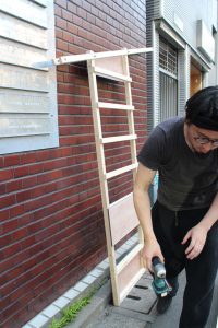 土台と左右のパーツを繋げていきます.屋台以外にも棚にもできるように横桟を設置しています.