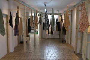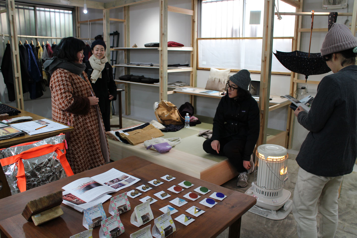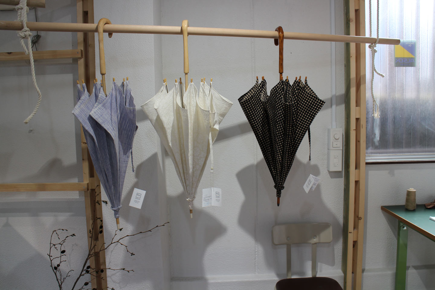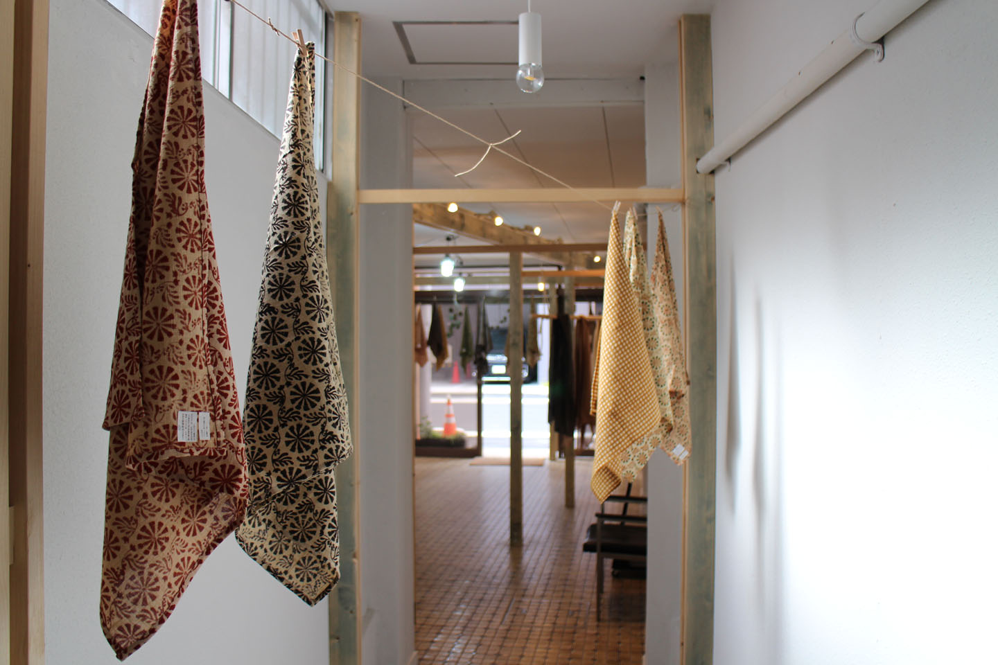 昨日から明日までの三日間日傘受注会を開催中で、それに合わせてお店の展示もガラリと変わっています.手前のスペースは、今回の日傘イベントの生地を作っているMula:working clothさんのオリジナルテキスタイルのハンカチが梁間の間をフワフワと展示されていました.Mula:working clothさんは、インド伝統の手染技法「ブロックプリント」を使った自然染のオリジナルテキスタイルや手つむぎ手織りのセレクト布、それらの布を使って洋服をつくったり、空間への提案をしているブランドです.2015年春にスタートし、今年の春夏の新たな試みとして、オリジナルテキスタイルから日傘に仕立てるという試みを始めたそうです.