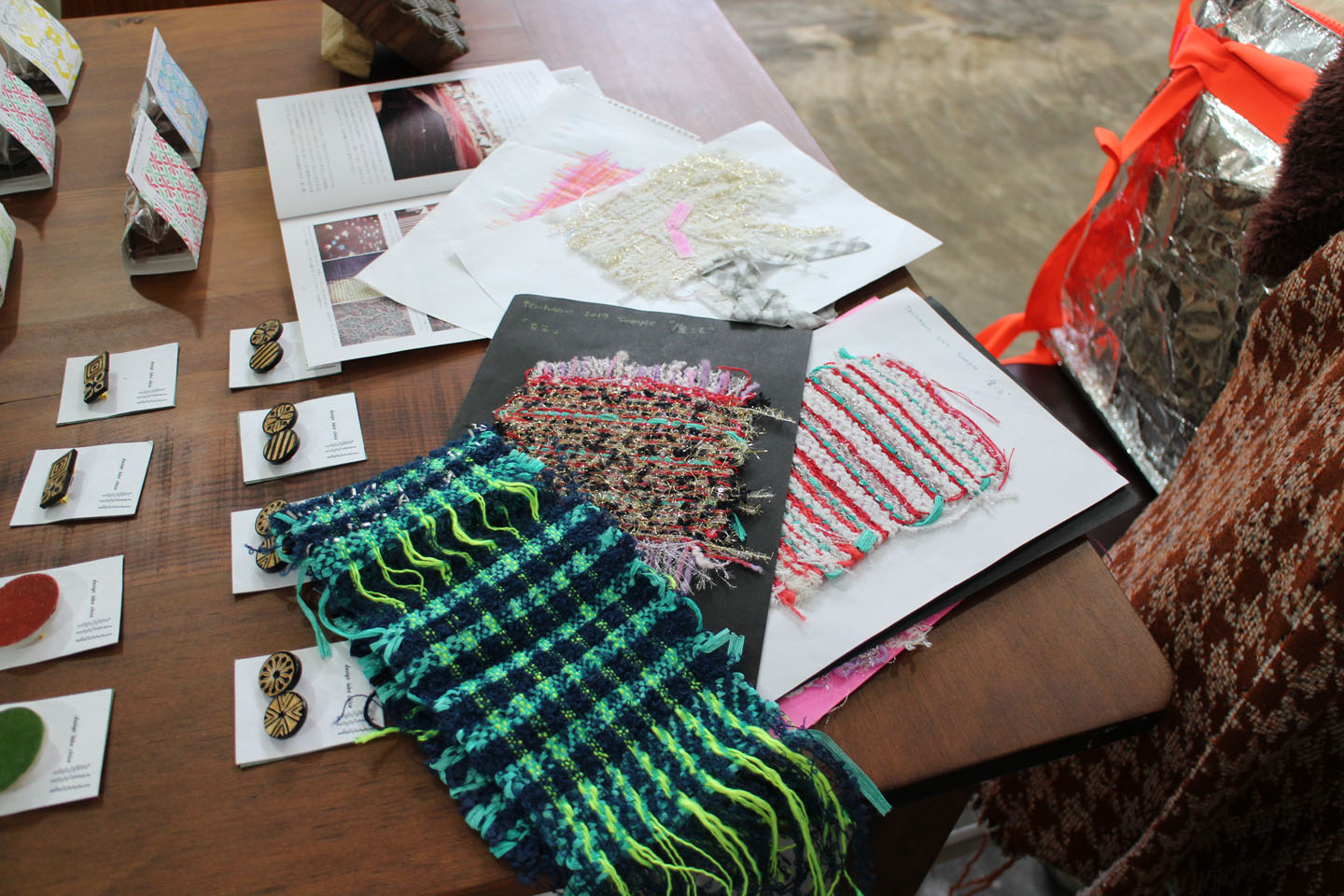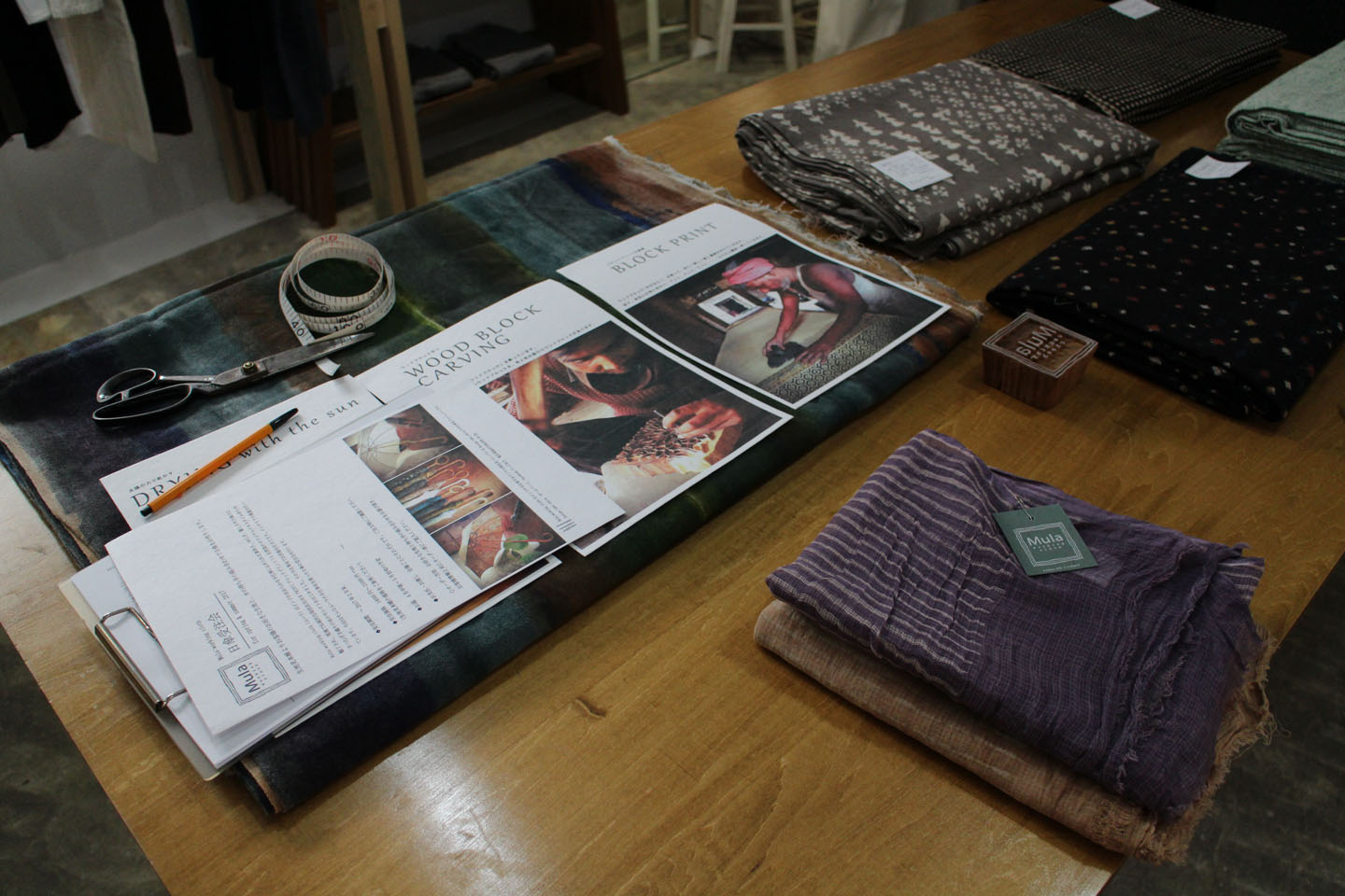 その他にもブローチやブロックプリントのハンコ、生地の切売なんかも合わせて行っています.