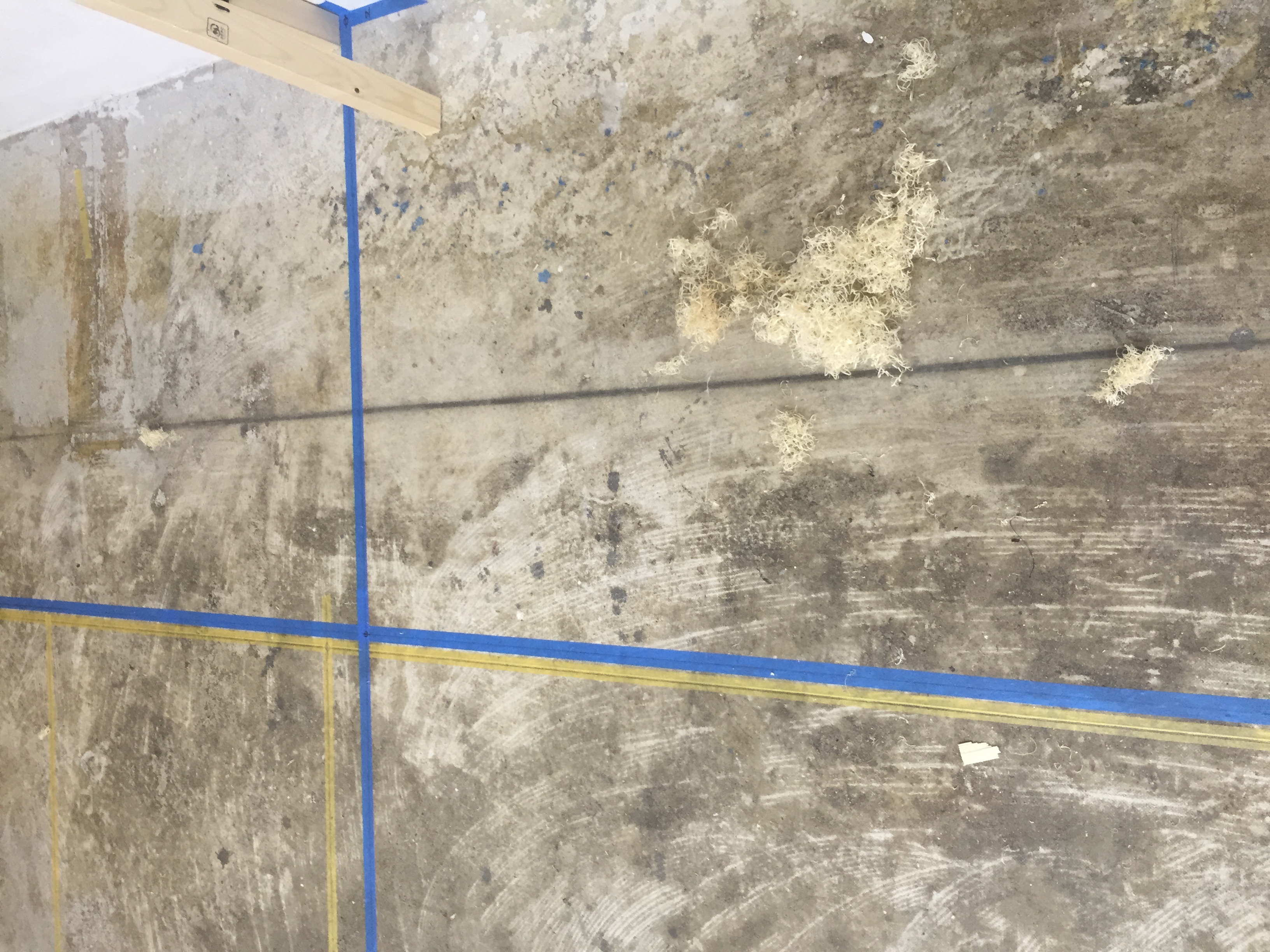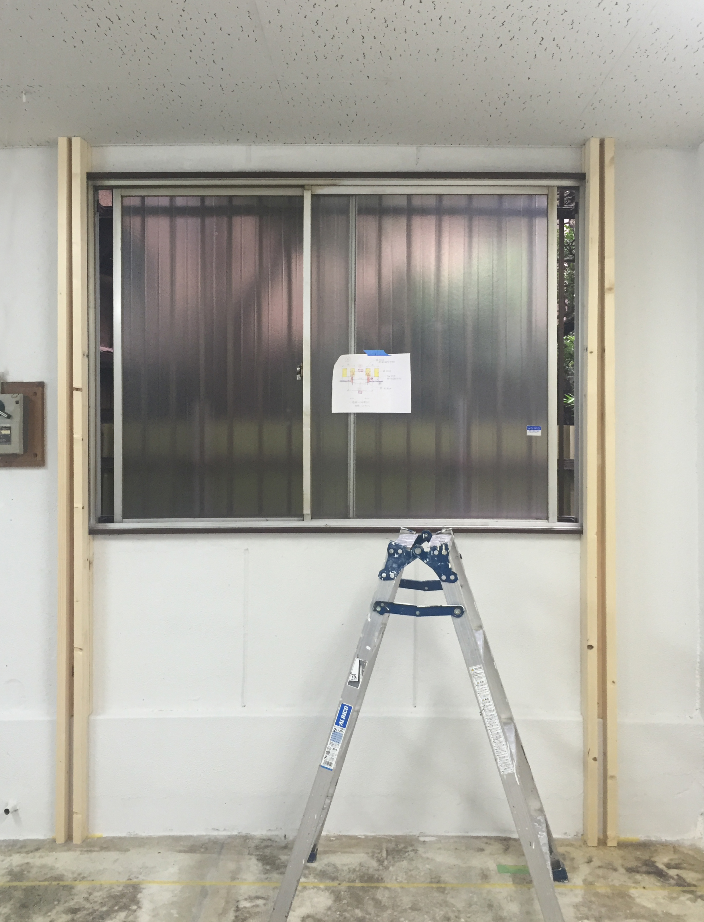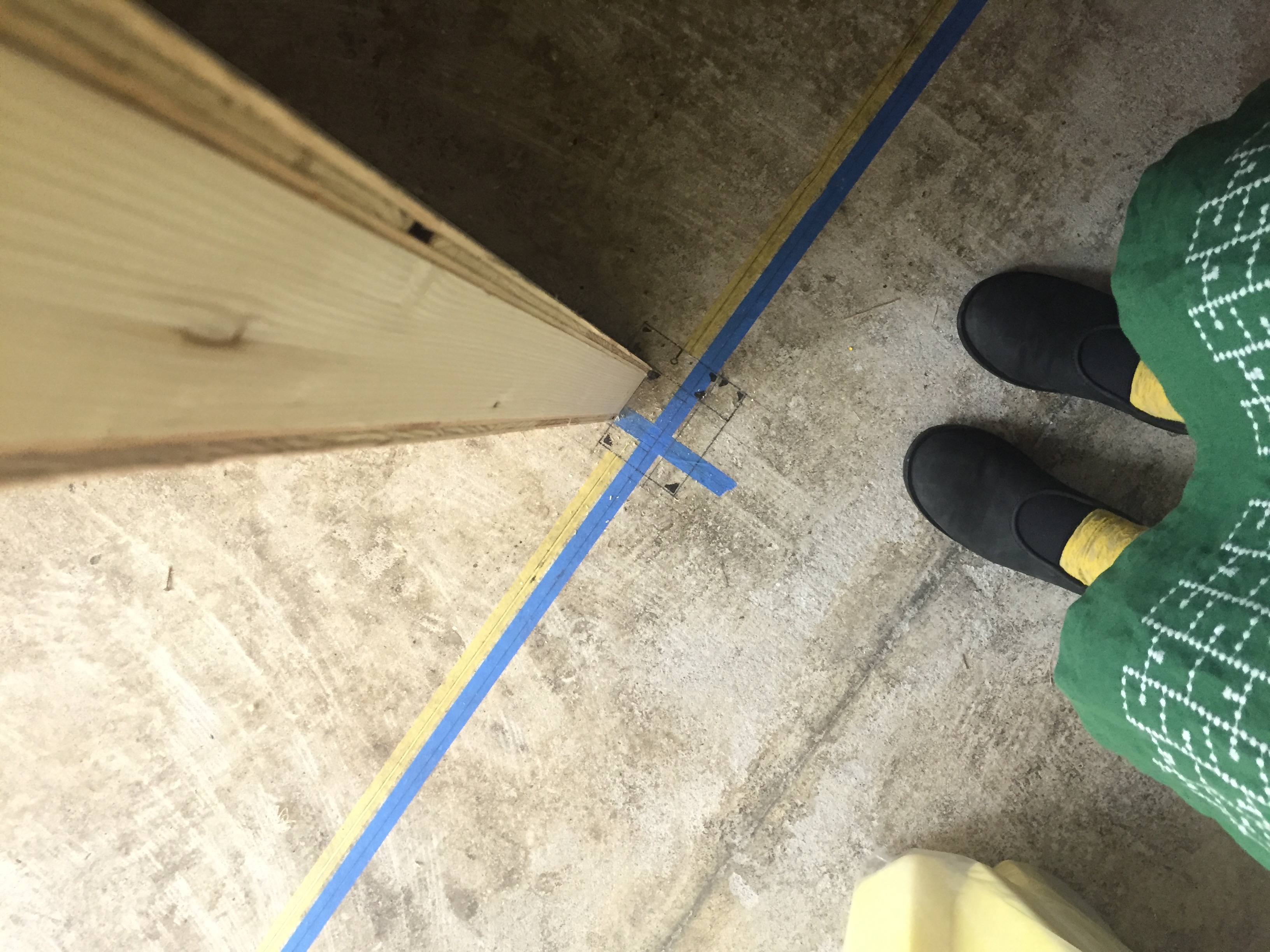 作っていた奥の壁は下地まで完了していました.一番奥は将来トイレになるので、防音のためグラスウール(左の写真の右側にある黄色い物です)を壁内に入れてもらっています.右の写真、床面にはこれから作る建具の枠周りが実寸でプロットされています.