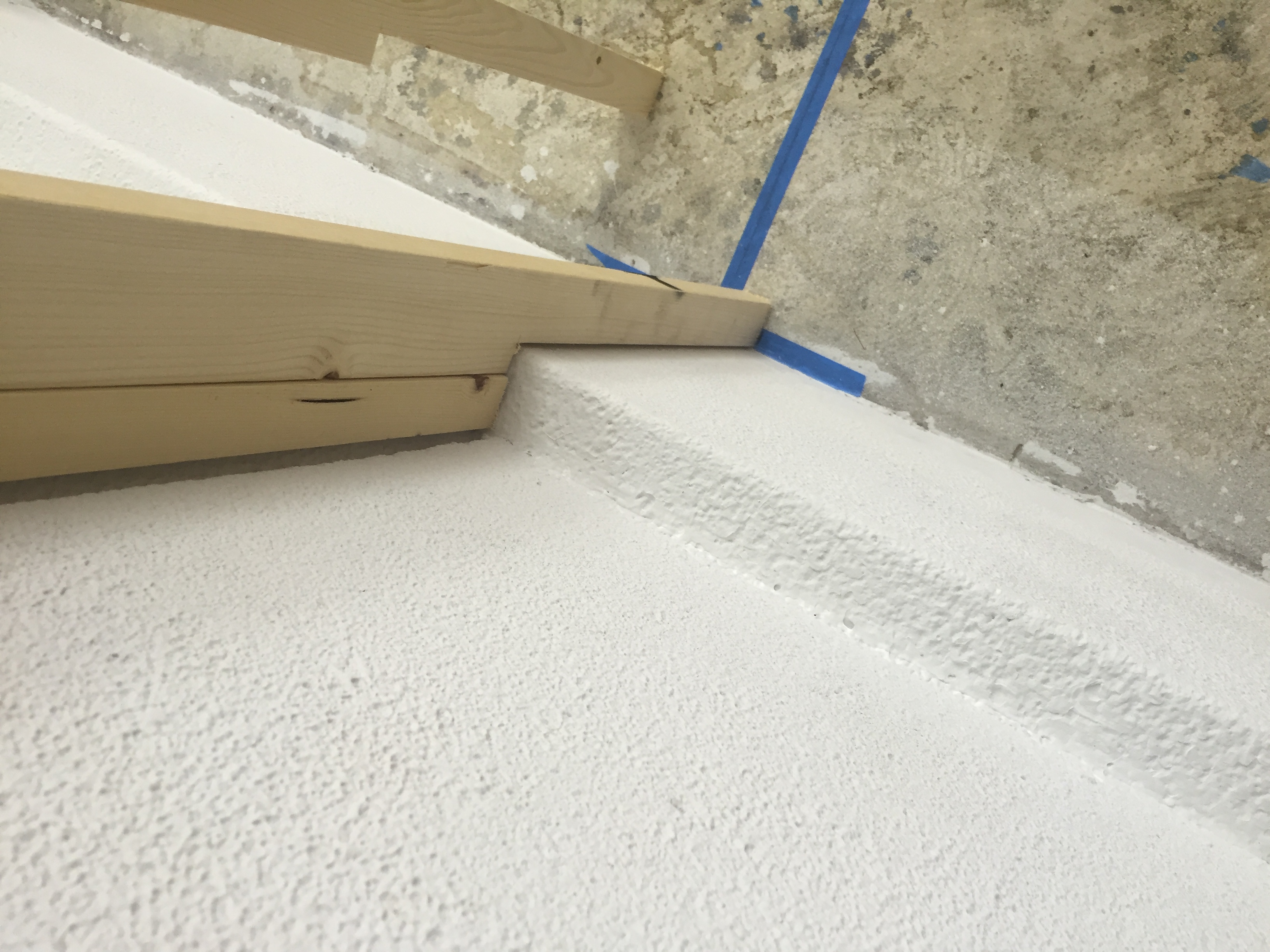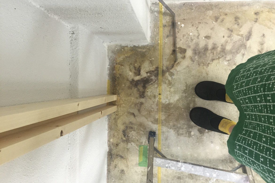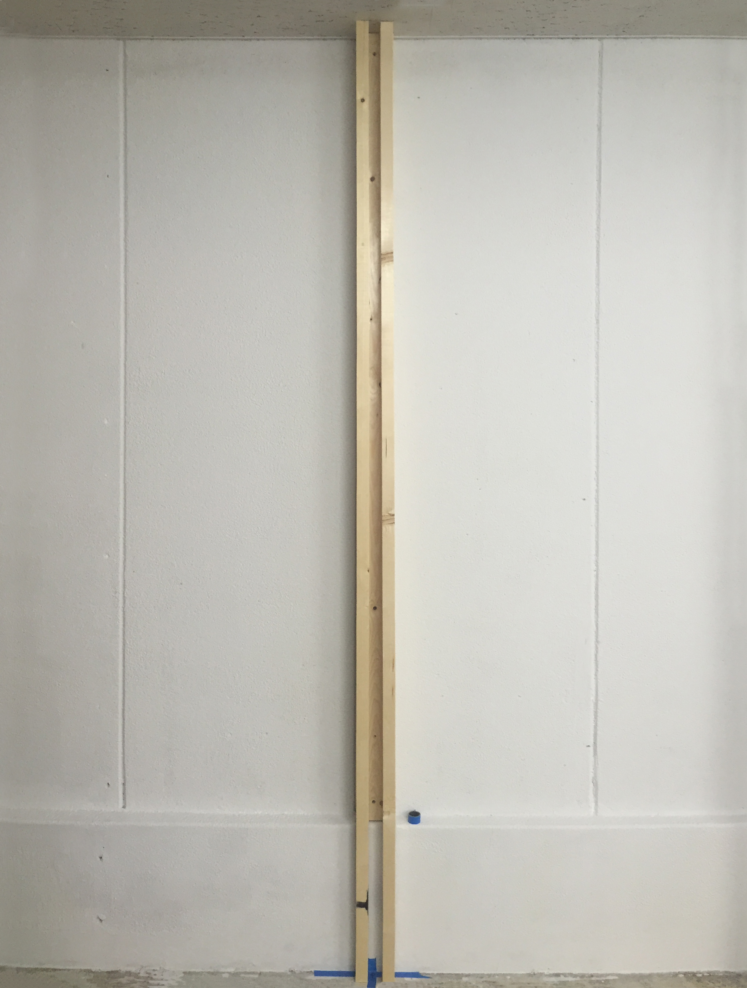 作っていた奥の壁は下地まで完了していました.一番奥は将来トイレになるので、防音のためグラスウール(左の写真の右側にある黄色い物です)を壁内に入れてもらっています.右の写真、床面にはこれから作る建具の枠周りが実寸でプロットされています.