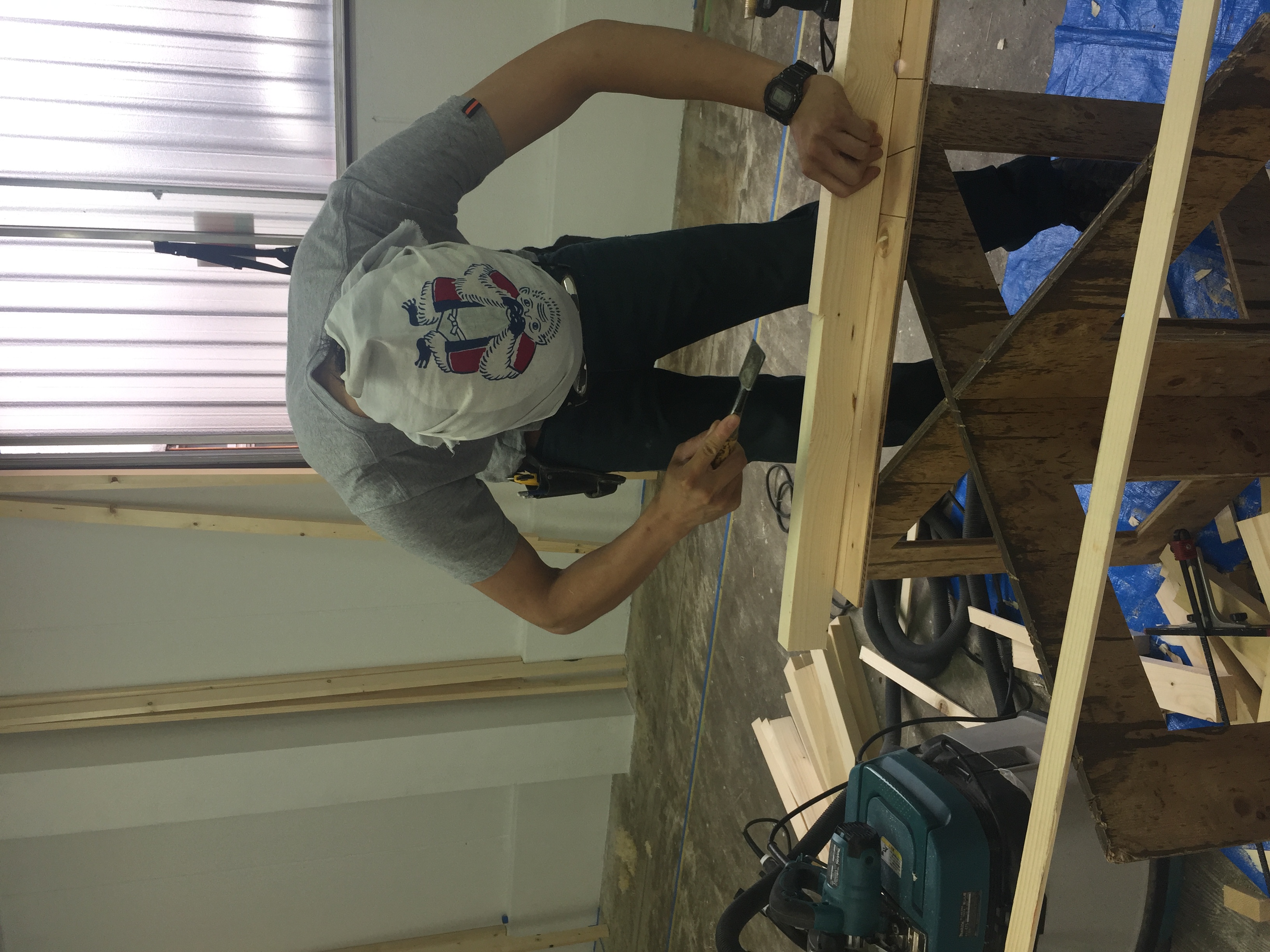 C棟の方の壁際の柱もいくつか切り出しが終わっていました.既存の建築は、天井高さもそれぞれで、また基礎梁部分が室内に凹凸として現れています.大工さんはその場で実測して加工し合わせて、またズレを調整してという流れで作業をしています.壁面に立ててみて、柱同士の留め方をどうするか大工さんと話ました.