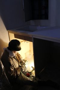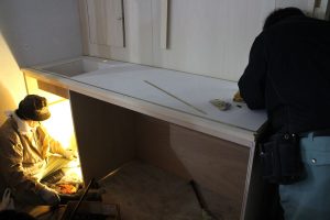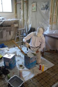 本日は、塗装屋さんが天井の塗装に入っていました.チョコレート、ケチャップ、マスタードみたいな塗料で真白の塗料から既存の天井の色に合わせて調色を行っていました.奥のスペースでは設備屋さんが入り、既存の配管に接続作業をしていました.そして現場監督の井出さん自ら、洗面台の枠の真鍮をカットしています.
