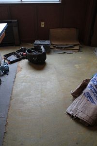 二部屋あるうちの道路側の部屋の既存の床はカーペットです.カッターを入れてビリビリっと剥がしていきます.