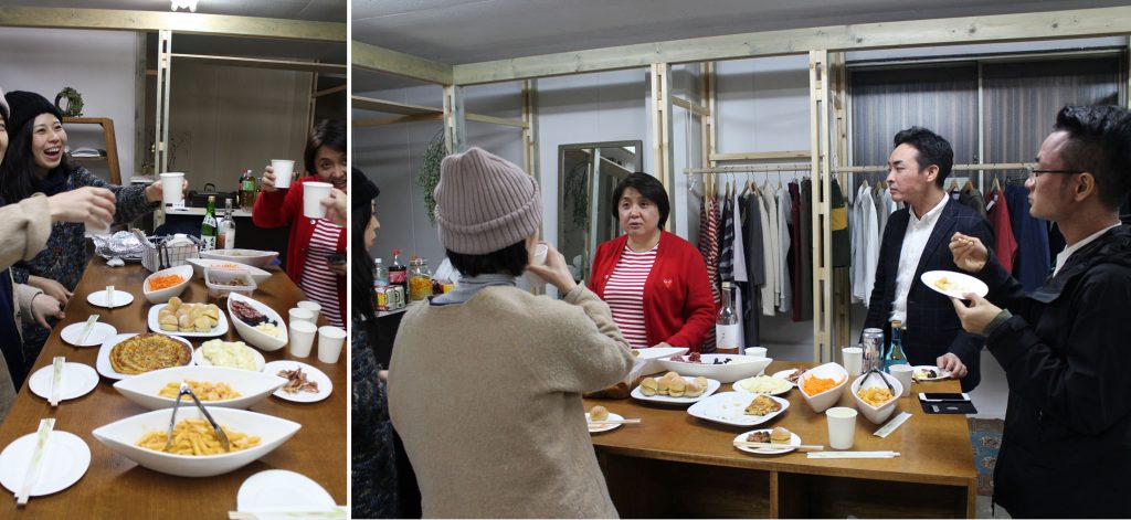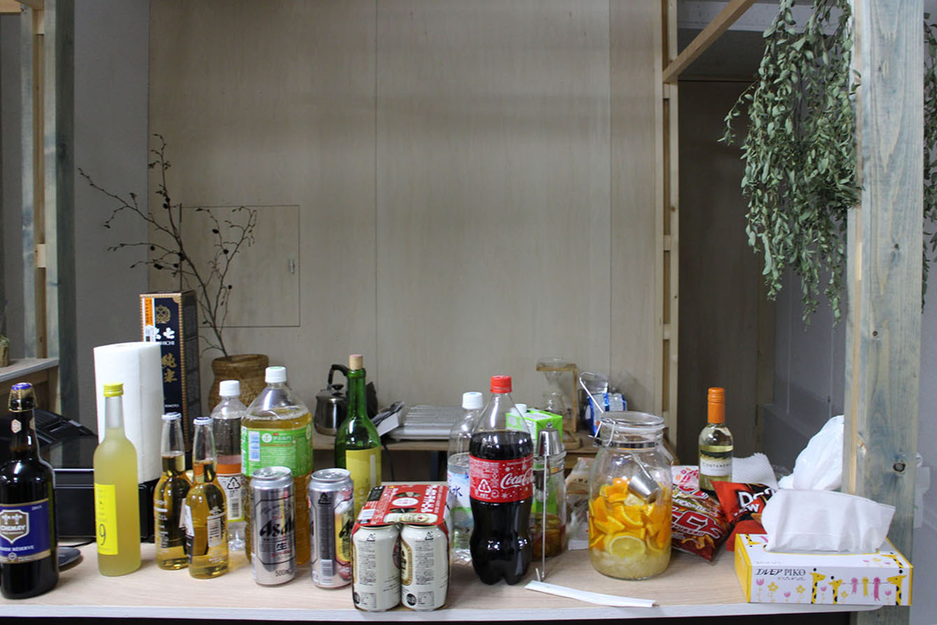 料理は、近所のGoloso(ゴローゾ)さんに作って頂き、みんなで飲み物を持ち寄るというスタイルで行いました.飲み物がたくさんです!yohaku代表渡辺さんと安田君は、第三期工事の洗面台のMORTEX施工に関して、見積と工程表の打合せをしていました.