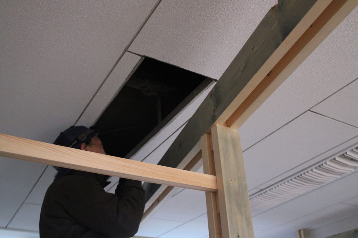 昨年末の解体工事から引き続き3F部分はミシン場にするために動力を引き込む工事をします.第三期工事は、5つの床プロジェクト と同じ株式会社シグマテックの現場監督と電気屋さんのコンビです.代表渡辺さんと共に引き込み位置や方法を確認しました.